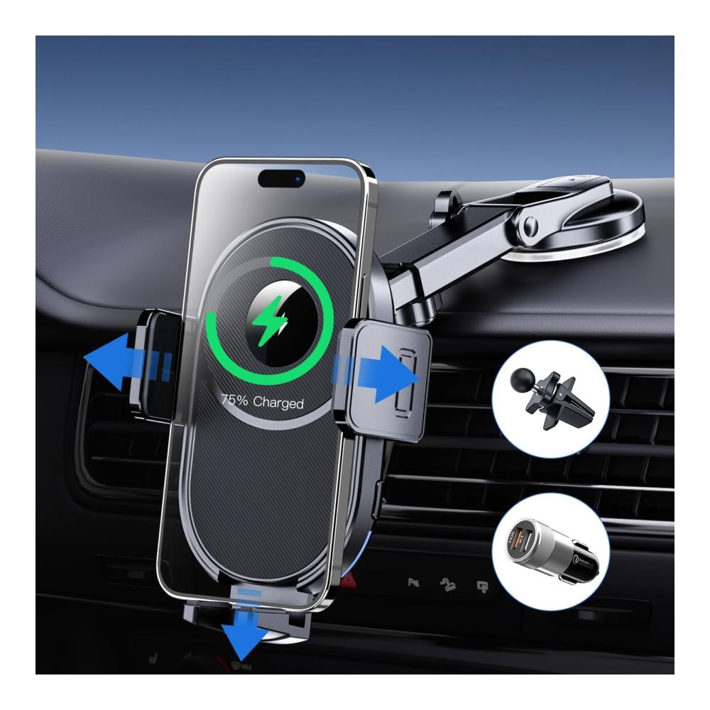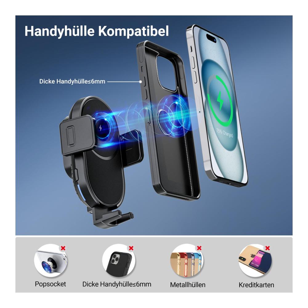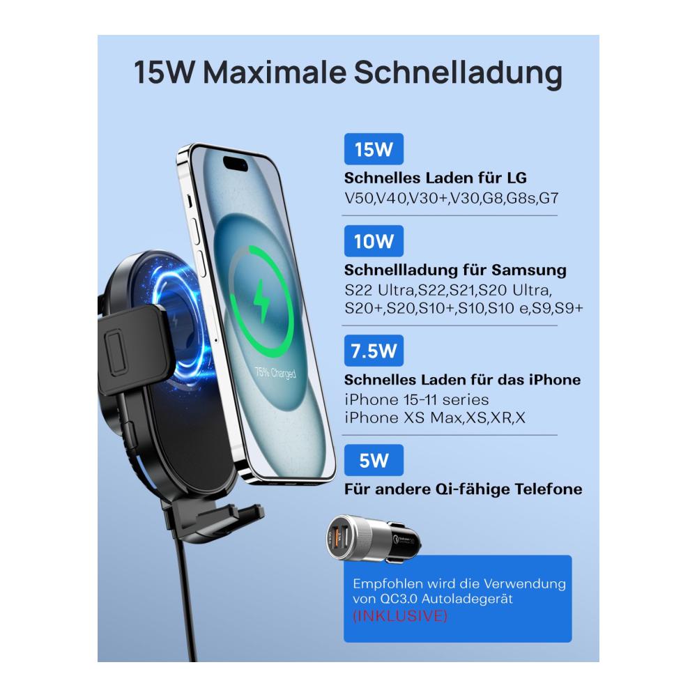 15W Auto Handyhalterung mit Ladefunktion – Der aufgerüstete Chip sorgt für intelligentes und sicheres Laden Ihres Qi-fähigen Geräts mit der schnellsten Geschwindigkeit. Unterstützt 15W maximale Ladegeschwindigkeit für LG V60/V50/V40/V30 , 10W Schnellladegerät für Samsung Galaxy S24 Ultra/S23/S22/S21/Note 10 , 7,5W Schnellladegerät für iPhone 15/14/13/12 Pro Max/11/XS Max/X und 5W für andere kompatible Telefone. Erfordert QC 3.0 Autoladeadapter (im Lieferumfang enthalten) für 15W, 10W und 7,5W Schnellladung.