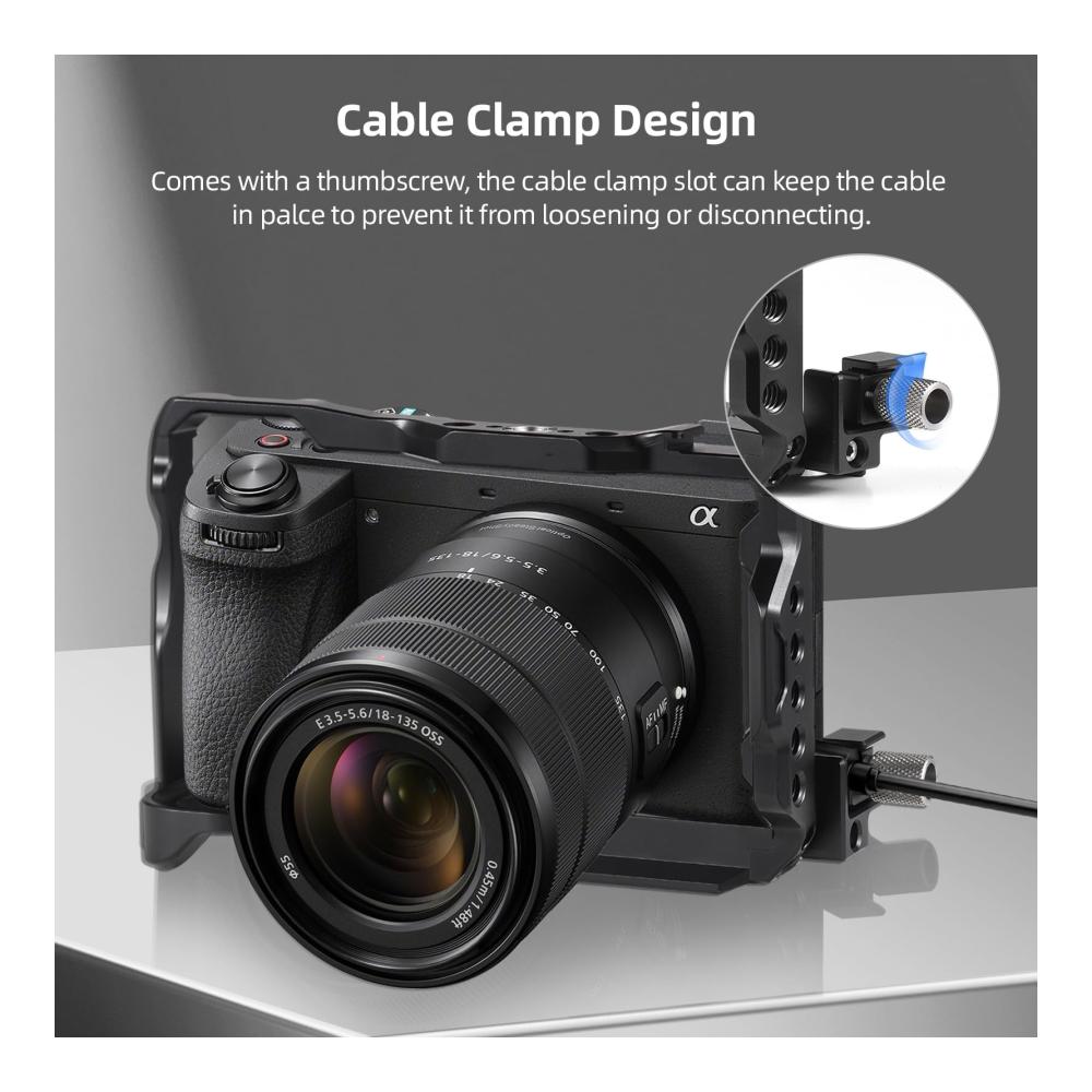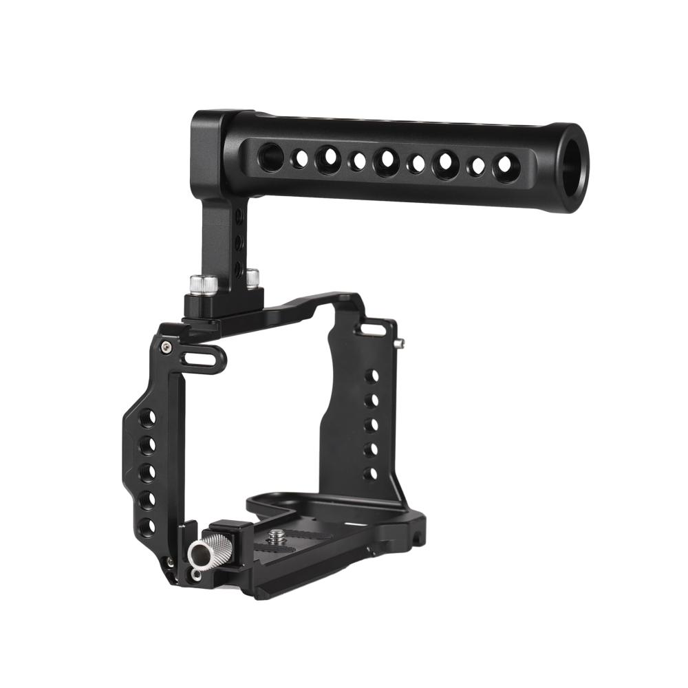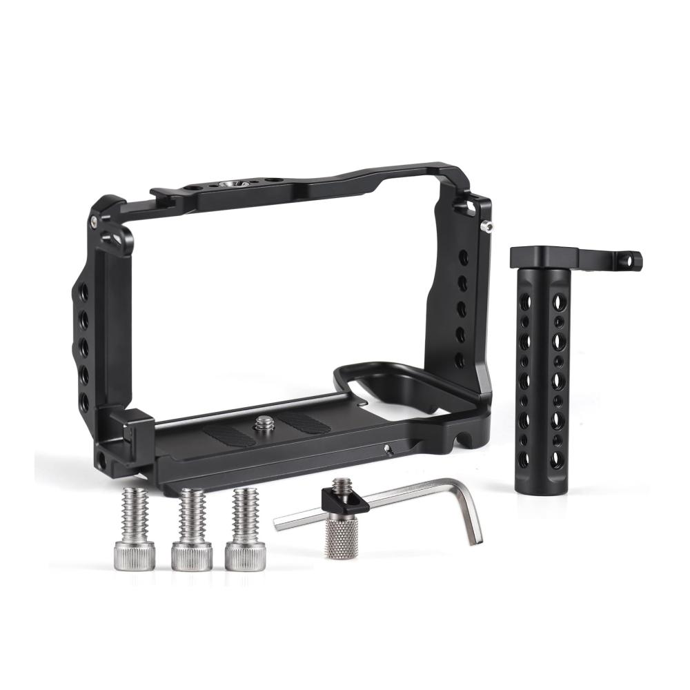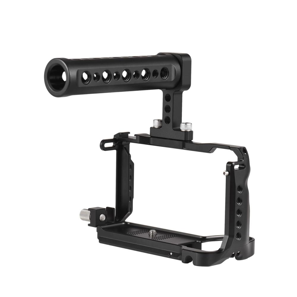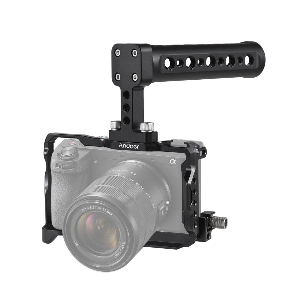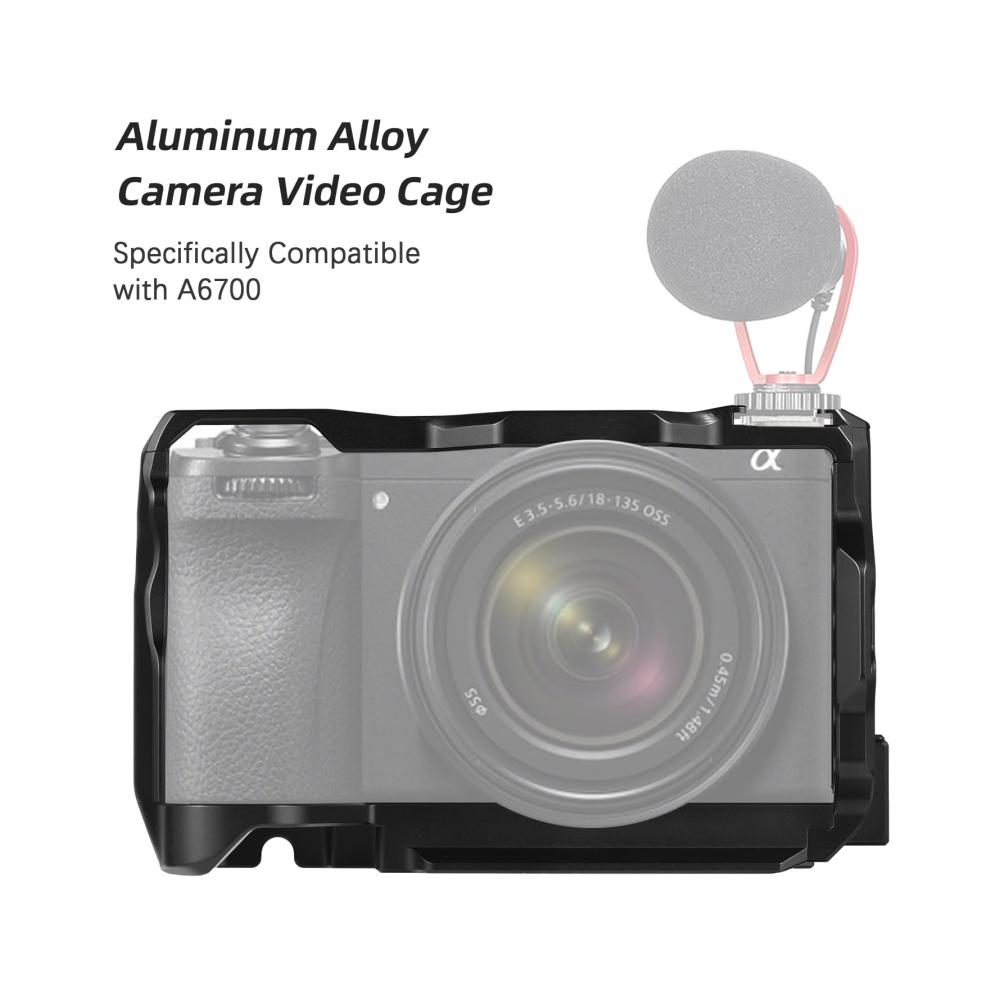 Entdecken Sie den vielseitigen Kamerakäfig mit Top-Griff, der speziell für die Sony A6700-Kamera entwickelt wurde. Hergestellt aus langlebiger Aluminiumlegierung, bietet er optimalen Schutz und ist dennoch leicht und tragbar. Mit integriertem Arca-Schnellverschlussschlitz und zahlreichen 1/4-Zoll-Gewinden ist er äußerst vielseitig und kompatibel mit einer Vielzahl von Zubehörteilen. Die Kaltschuhhalterung ermöglicht die Befestigung von LED-Leuchten oder Mikrofonen. Ein Must-have für professionelle Filmer und Fotografen.