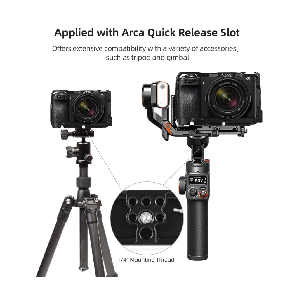 【Umfassende Kompatibilität】 Dieser Kamerakäfig bietet mit seinem Arca-Schnellverschlussschlitz und den integrierten 1/4-Zoll-Schraubanschlüssen umfassende Kompatibilität mit einer Vielzahl von Zubehörteilen.