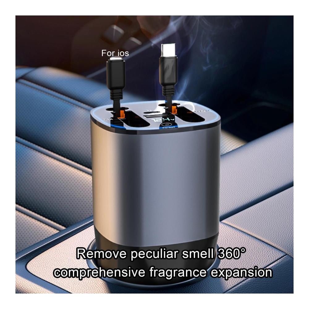 ➧Multifunktionen: Laden Sie bis zu 4 Geräte gleichzeitig auf und genießen Sie die Aromatherapie-Funktion, eine perfekte Möglichkeit, den Duft Ihres Autos frisch zu halten. Unser 5-in-1-Design verfügt über 2 einziehbare USB-C IOS-Kabel, 1 USB-A- und 1 PD-Anschluss, eine vielseitige Lösung für verschiedene Geräte.