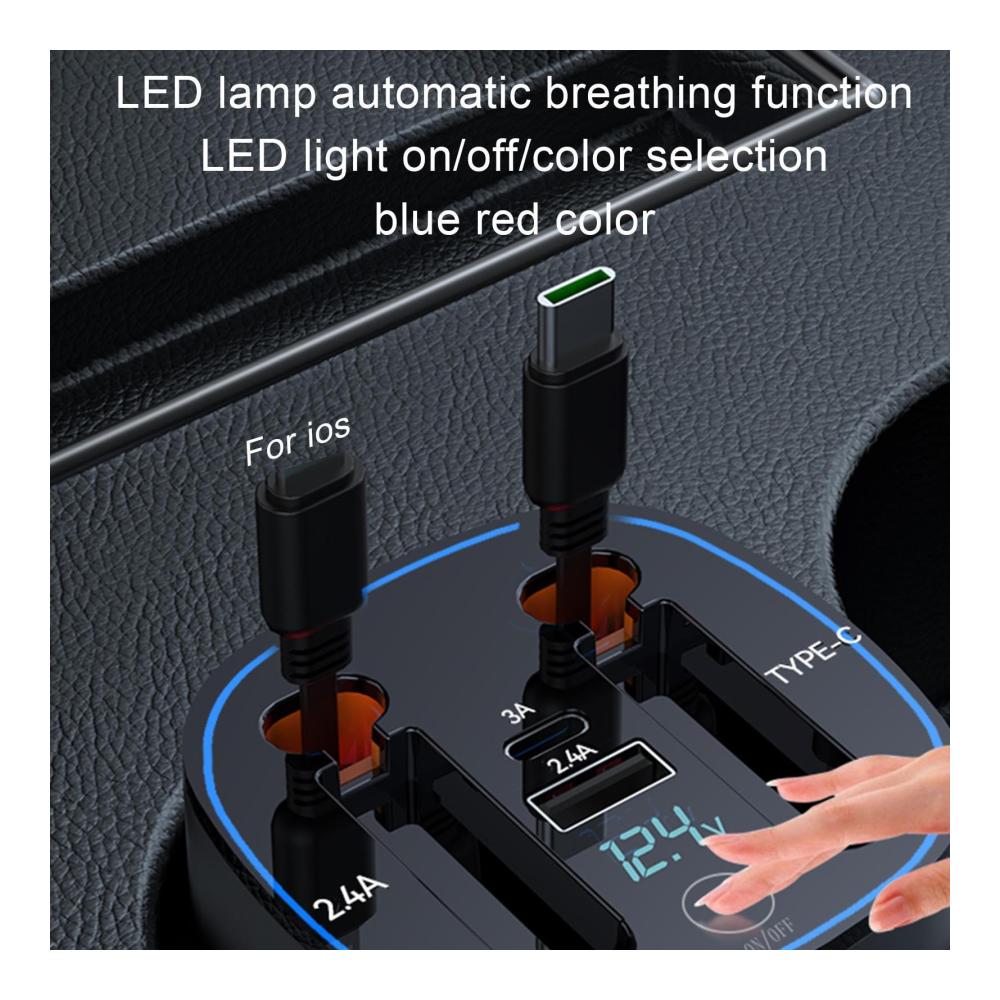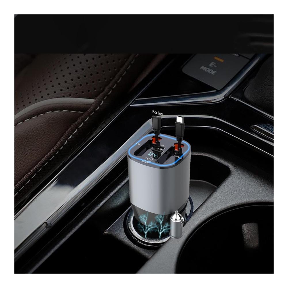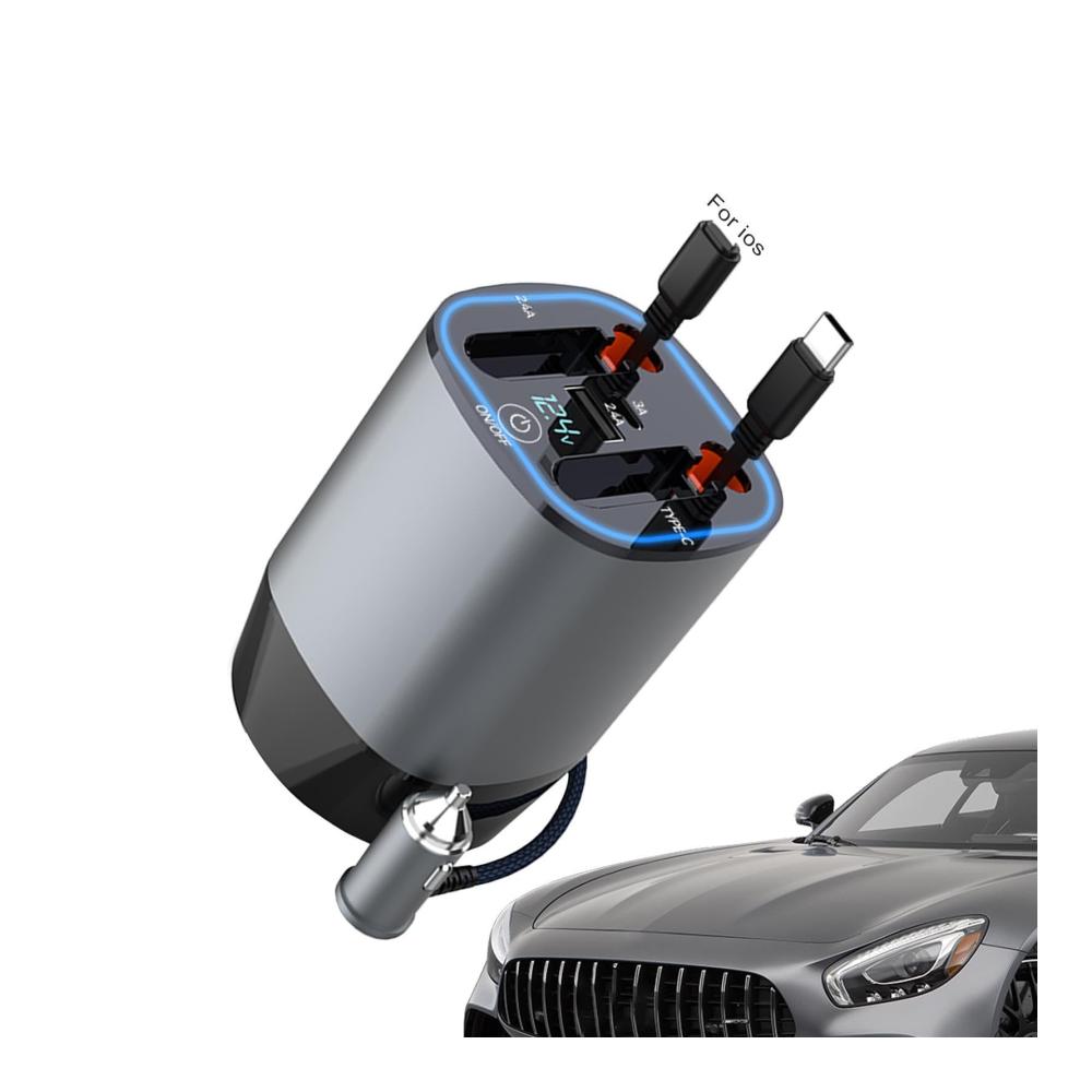 Unser Kfz-Ladegerät bietet schnelles Aufladen und mehr. Mit Unterstützung für bis zu vier elektronische Geräte gleichzeitig, automatischem Einzug für ordentliche Aufbewahrung und passendem Design für Auto-Getränkehalter. Effektiver Schutz vor Überladungsschäden. Passend für viele Automodelle. Spezifikationen: Material: ABS, PC, Metall; Schnittstellen: 1x USB-C-Kabel, 1x IOS-Kabel, 1x USB-A, 1x USB-C; Anzeigespannung: 10–30V; Kabellänge: 800 mm; Eingang: DC12-24V; Leistung: 100W; Anwendungsbereich: Mobiltelefone, Tablets, intelligente elektronische Geräte. Lieferumfang: 1x Schnelles Autoladegerät.