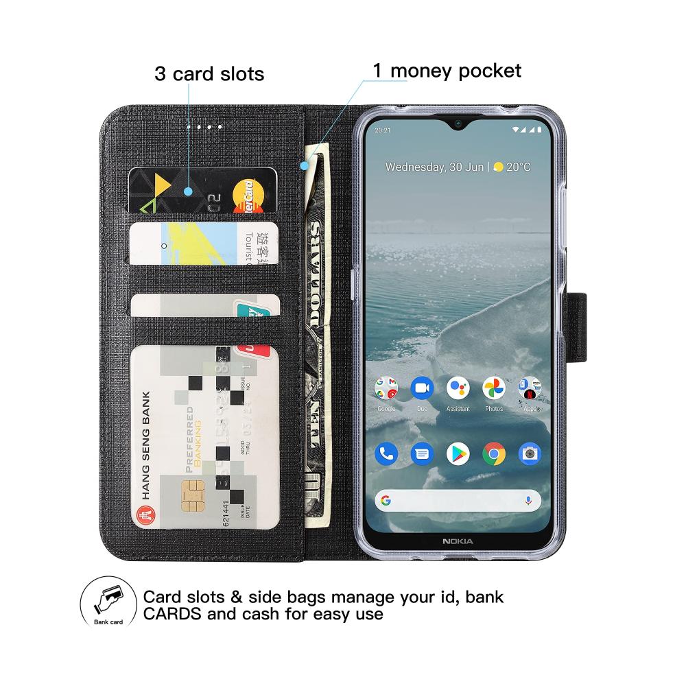 Diese stilvolle Klapphülle für das Nokia G10 vereint Funktionalität und Eleganz. Mit einem praktischen Magnetverschluss, Kartenfächern und einem Bargeldhalter bietet sie nicht nur Schutz, sondern auch eine Brieftaschenfunktion. Der eingebaute Ständer ermöglicht es Ihnen, Ihr Telefon freihändig zu verwenden. Die stoßfeste TPU-Bumper-Konstruktion schützt Ihr Gerät zuverlässig vor Beschädigungen. Erhältlich in elegantem Schwarz. Genießen Sie den Schutz und die Vielseitigkeit dieser Hülle für Ihr Nokia G10.