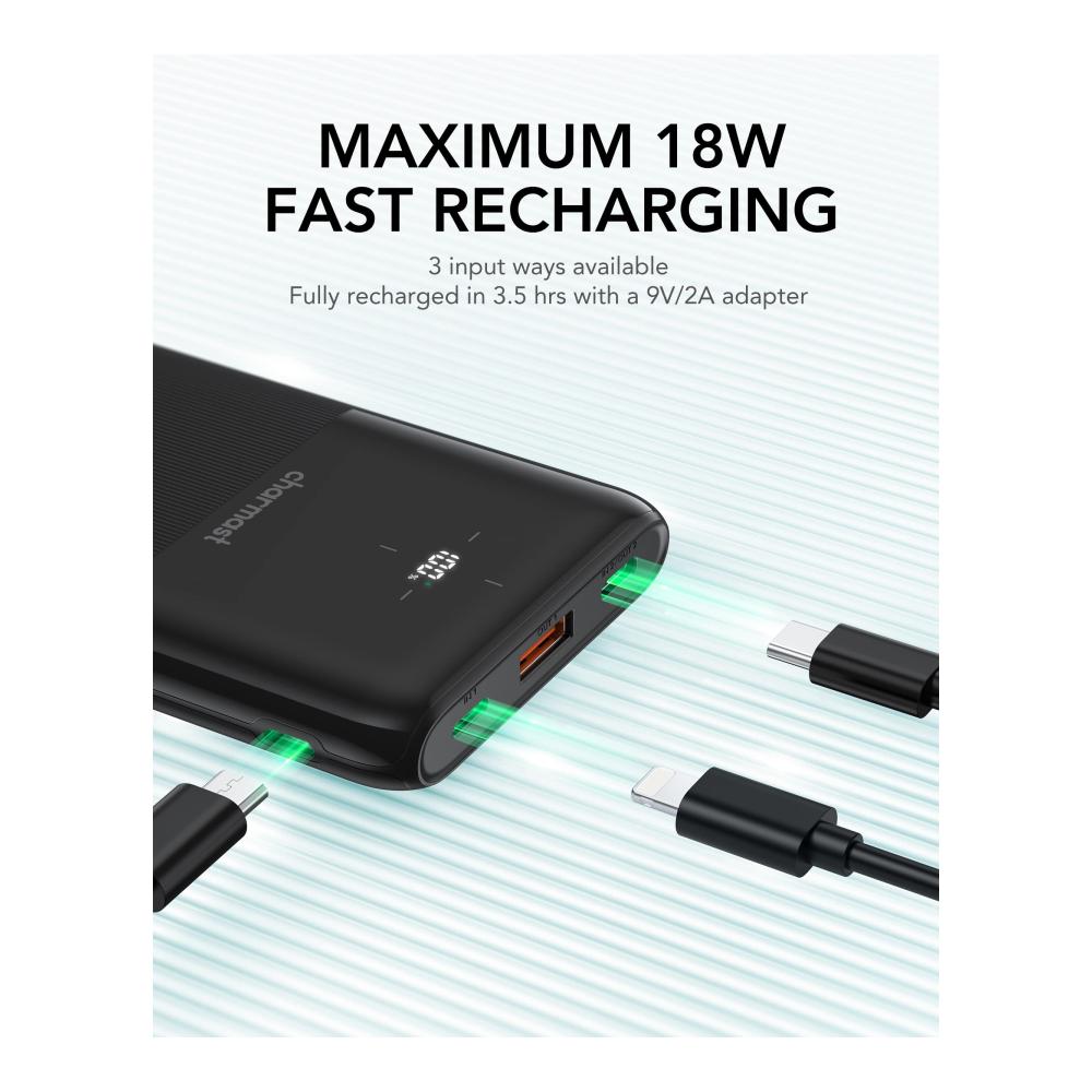 🔋【Schnelles Aufladen auf 3 Arten】 Diese Powerbank ist mit 3 Eingangsanschlüssen ausgestattet, einem Micro-USB-Eingang (max. 18W), einem USB-C-Eingang (max. 18W) und einem IOS-Eingang (10W), was mehr Optionen für ein verbessertes Benutzererlebnis bietet. Verwenden Sie den 18W-Eingangsanschluss mit Ihrem Kabel und Adapter mit PD-Protokoll, sodass Sie die Powerbank in nur 3,5 Stunden vollständig aufladen können, verglichen mit 6 Stunden mit einem gewöhnlichen 5V/2A-Adapter.