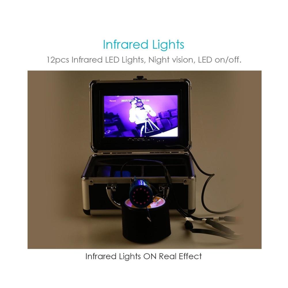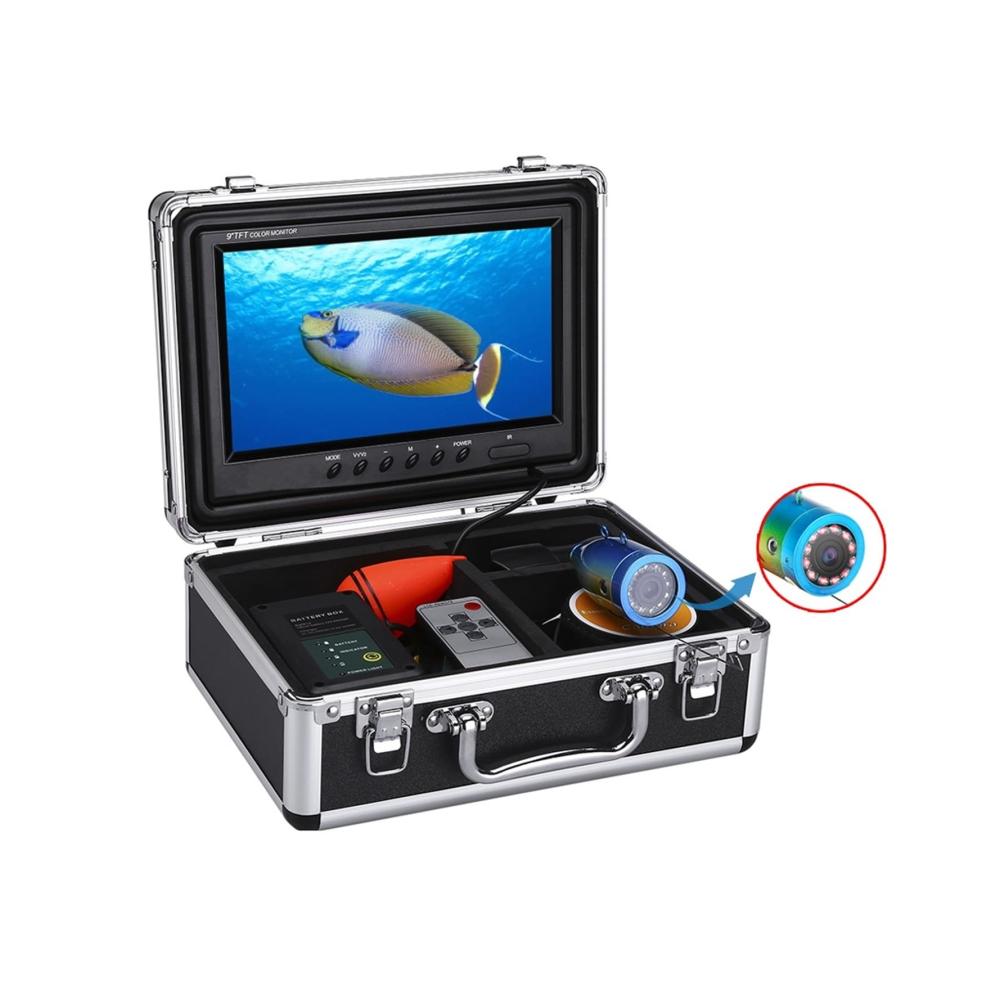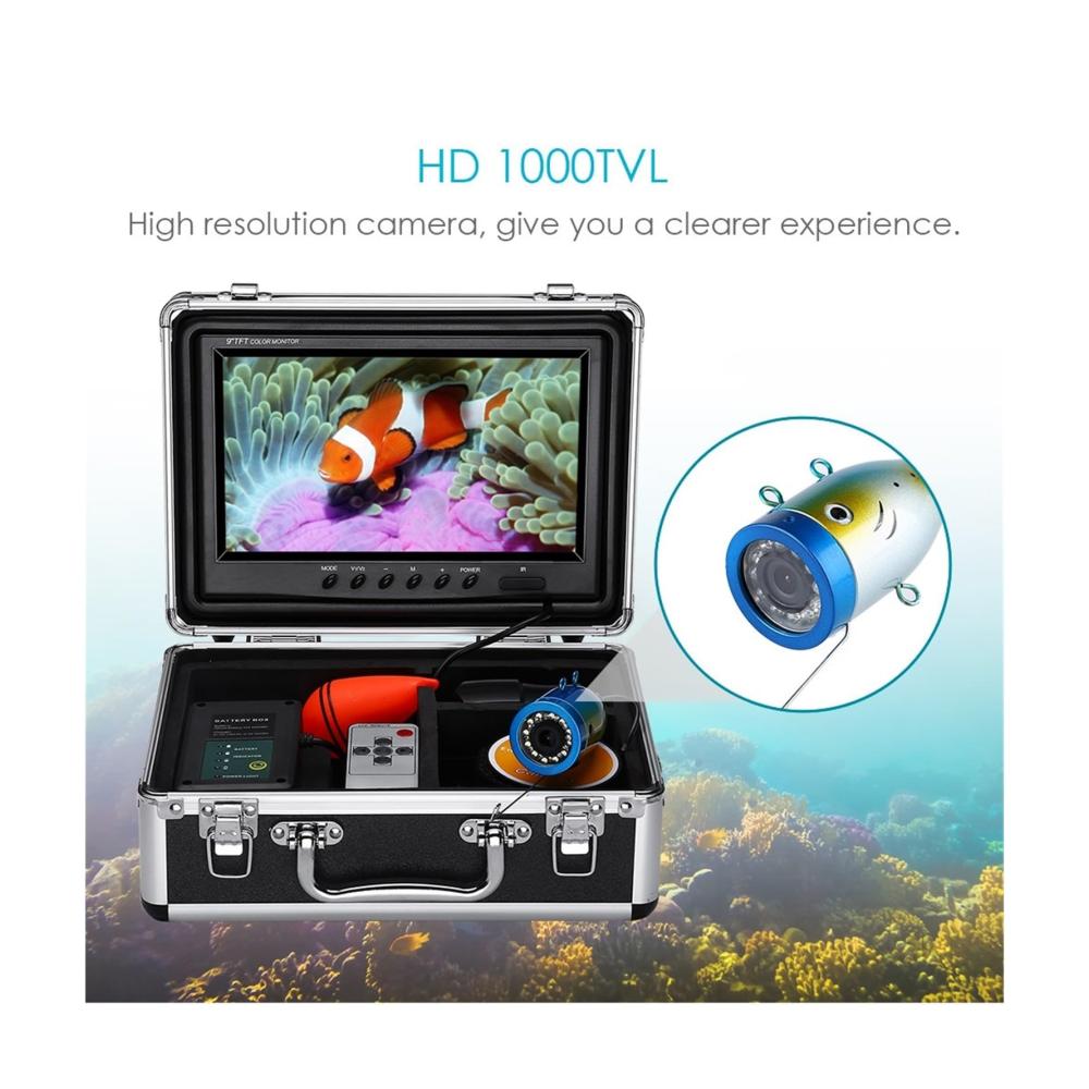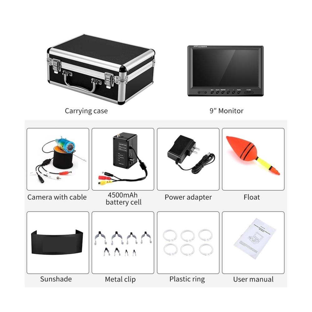Hauptmerkmale des 9-Zoll-Unterwasser-Fischfinders:9″ GROSSER FARBMONITOR: Die Bildanzeige ist realistischer und feiner. Der 9 Zoll größere TFT-Farbmonitor ist mit einer abnehmbaren Sonnenblende ausgestattet, die sich ideal für helle Umgebungen eignet.1000TVL-KAMERA MIT 12 INFRAROTLICHTERN: Speziell hergestellter 1000TVL-Programmchip und 12 IR-Lichter sorgen dafür, dass Fische in der dunklen Umgebung deutlicher gesehen werden.Bitte beachten Sie: Das Bild wird schwarzweiß, wenn Sie das Infrarotlicht öffnen.WASSERDICHTE IP68-KAMERA MIT 50 M KABEL: Vollständig wasserdichtes IP68-Design mit 50 m Kabel. Das Kabel ist stark und langlebig und hält einer Zugkraft von bis zu 30 kg stand.SPEZIELLE FISCHFORM, 92-GRAD-SICHTWINKEL: Dieses einzigartige Design wird die Fische nicht stören, es kann die Fische in ihre Nähe locken. Unter Wasser kann man Fische deutlich erkennen.6–8 Stunden Betriebszeit: 4500 mAh Akku mit hoher Kapazität im Lieferumfang enthalten, kann auch zur Lichtsteuerung verwendet werden.ABNEHMBARE SONNENBLENDE: Mit der abnehmbaren Sonnenblende können Sie das Bild auch in hellen Umgebungen klar sehen. Wenn Sie es nicht benötigen, können Sie es einfach entfernen.DVR-FUNKTION OPTIONAL: Sie können die Unterwasserlandschaften nach Ihren Wünschen aufzeichnen. Unterstützt maximal 32 GB TF-Karte.TRAGBARES DESIGN: Mit einem Aluminiumkoffer, wasserdicht und sturzsicher. Einfach zu lagern und zu transportieren.Anwendung: Eis-/Meeres-/Seeangeln; Überwachung der Aquakultur; Unterwassererkundung; Schwimmen/Tauchen/Schnorcheln.Wichtige Tipps:Bitte wischen Sie die Linse nach Gebrauch sauber. Hinterlassen Sie keine Wasserflecken.Produktspezifikationen:Bildschirmgröße: 9 ZollKamerapixel: 1000TVLKabellänge: 50 mNachtsicht: 12 Stück InfrarotlichterTagessicht: FarbeNachtsicht: wird bei schwachem Licht schwarz und weiß.Betrachtungsabstand: 0–3 mWasserdichtigkeit der Kamer