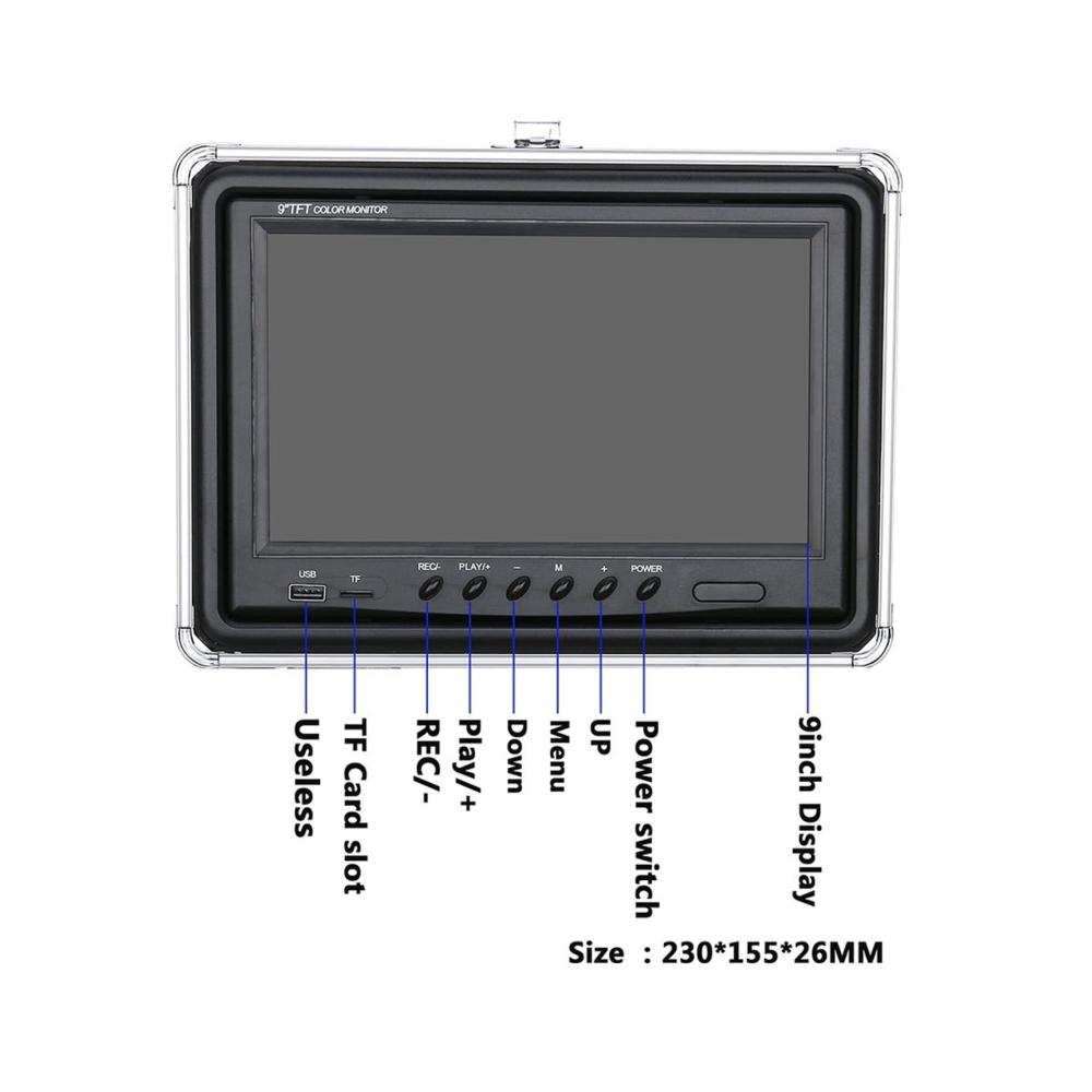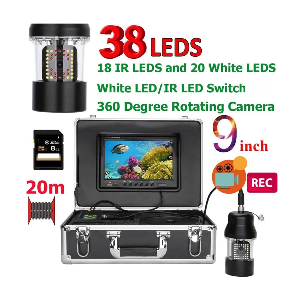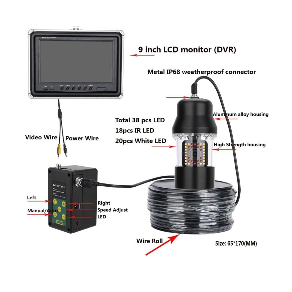9-Zoll-DVR-Recorder 20 m Unterwasser-Angelvideokamera Fischfinder IP68 Wasserdicht 38 LEDs 360 Grad drehbare KameraBeschreibung der Angelkamera:Dieses Produkt, das Sie gerade ansehen, ist das neueste beliebte, modische, gut aussehende und praktische UnterwasserproduktVideokamerasystem. Es verfügt nicht nur über einen großen Farbbildschirm, sondern auch über eine Höhenauflösungskameraverfügt über HD CCD 700TV-Zeilen. 20 weiße LEDs, 18 Infrarotlampen, hohe Intensität. 4 verschiedene LED-Status: WeißLED an, IR-LED an, alle LED an, alle LED aus, um eine bessere Bildqualität zu erzielen. Dieses Unterwasser-MonitorsystemHat auch die DVR- und Fotofunktion. Außerdem wird dieser Artikel mit einer 8-GB-TF-Karte und maximal diesem System geliefertUnterstützt 32 GB TF-Karte.Produktbeschreibung:9-Zoll-TFT-Farb-DVR-Funktionsmonitor mit Sonnenblende für helle AußenumgebungenUnterwasser-Video-CCD-Kamera mit 0-360-SchwenkHeavy Duty wasserdicht 50M.18 IR-LEDs und 20 weiße LEDs.Power Box: BatteriestatusFür Unterwassererkundung/Angeln/Brunneninspektion!ist eine Unterwasser-Videokamera mit motorisiertem Schwenkkopf von 0-360 zur Betrachtung von Objekten in alle Richtungen.Es ist eine CCD-Kamera, sehr scharfes Bild. Es wurde speziell für Unterwasseraktivitäten entwickelt, zMeeresbodenerkundung, Angeln und Eisfischen, Brunneninspektion usw.Typische Anwendungen sind:UnterwassererkundungAngeln im Eis/SeeSchwimmen/Tauchen/SchnorchelnBrunnen-/RohrinspektionHauptmerkmale:1. CCD-Farbvideokamera mit 1/3″ HD CCD2. Ferngesteuerter Schwenkkopf für 0-360-Grad-Ansicht in alle Richtungen3,7 Geschwindigkeitsanpassung von schnell bis langsam für verschiedene Anwendungen4. Alle LEDs können für die beste Bildqualität unter verschiedenen Bedingungen ein- und ausgeschaltet werden5,20 m langes, robustes, korrosionsbeständiges Kabel6. Alumini