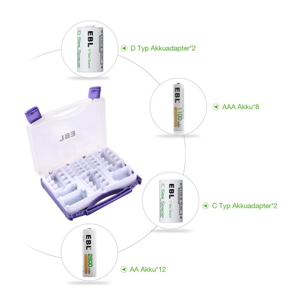Super Akku Set enthält Ni-MH Akkus: 8*AAA Akku 1100mAh, 12*AA Akku 2800mAh; Batterieadapter: 2*C Akkuadapter, 2*D Akkuadapter; Bestimmt noch 1* Akku Aufbewahrungsbox