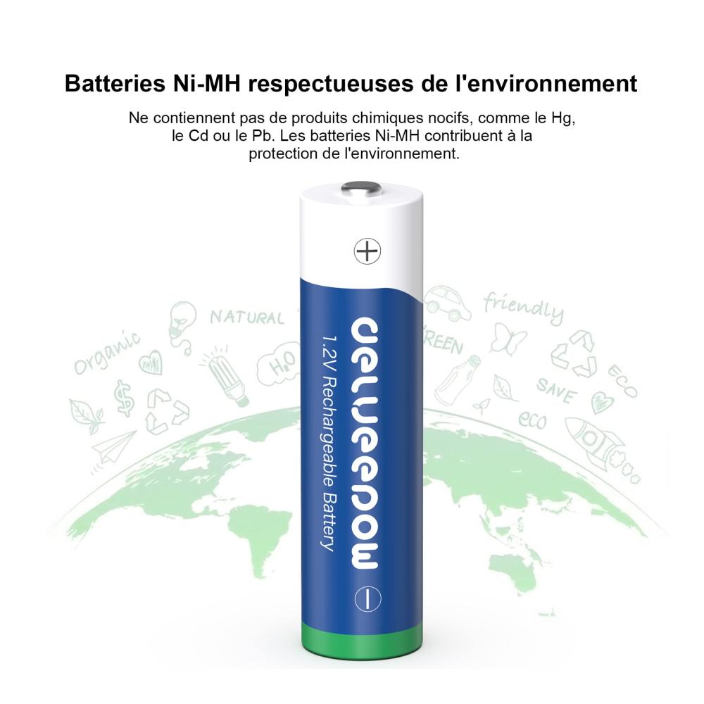 Acht AAA Ni-MH BatterienAusreichende Anzahl von Batterien zum gleichzeitigen Aufladen mehrerer Geräte | Bis zu 1200 ZyklenDelyeepow AAA Ni-MH-Akkus mit spezieller Metall- und Schutztechnologie verlängern die Lebensdauer jeder Batterie auf 1200 Zyklen. | Mehrere SchutzfunktionenDelyeepow wiederaufladbare NiMH Batterien, AA/AAA-Ladegerät mit eingebautem Smart Chip, verhindert Kurzschluss und automatischen Ladestopp. |