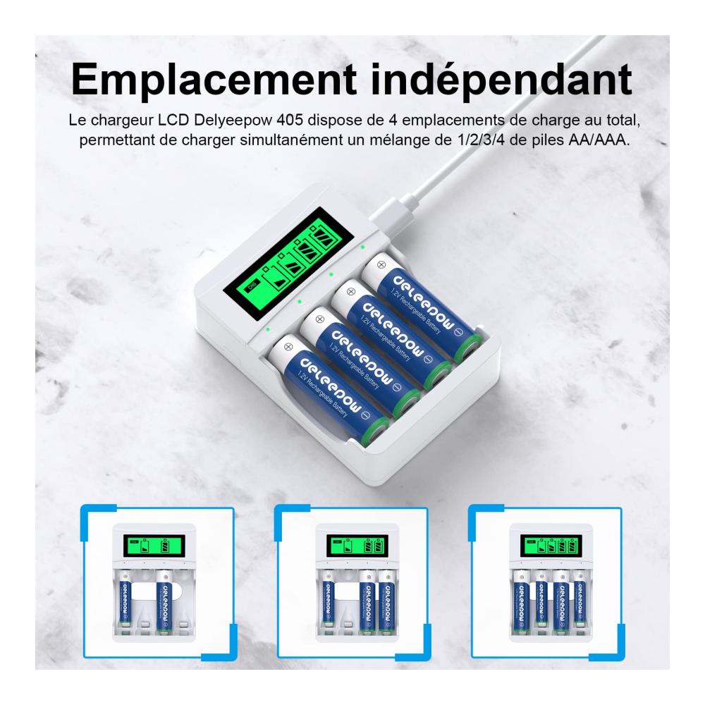 Unabhängiger LadeschachtKann 1/2/3/4 AA/AAA-Batterien ohne Kopplung aufladen Der LCD-Bildschirm zeigt den Ladestatus für jeden Steckplatz an | USB-LCD-Ladegerätkann den Akku mit einem Laptop oder einem Adapter oder einem anderen USB-Anschluss aufladen | Einfaches Design und HaltbarkeitDelyeepow 405LCD Batterieladegerät mit 8 NiMH AAA-Batterien für einfachen Zugang und bereit für Ihre Ladeanforderungen |