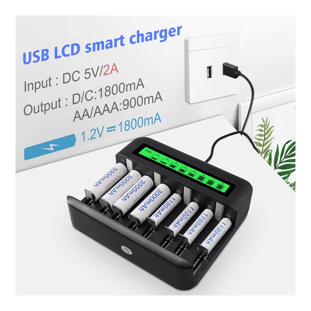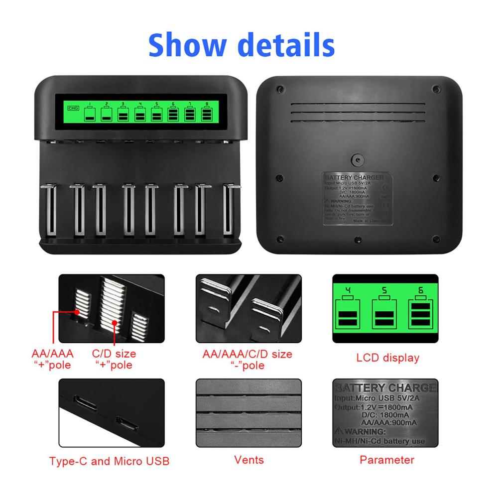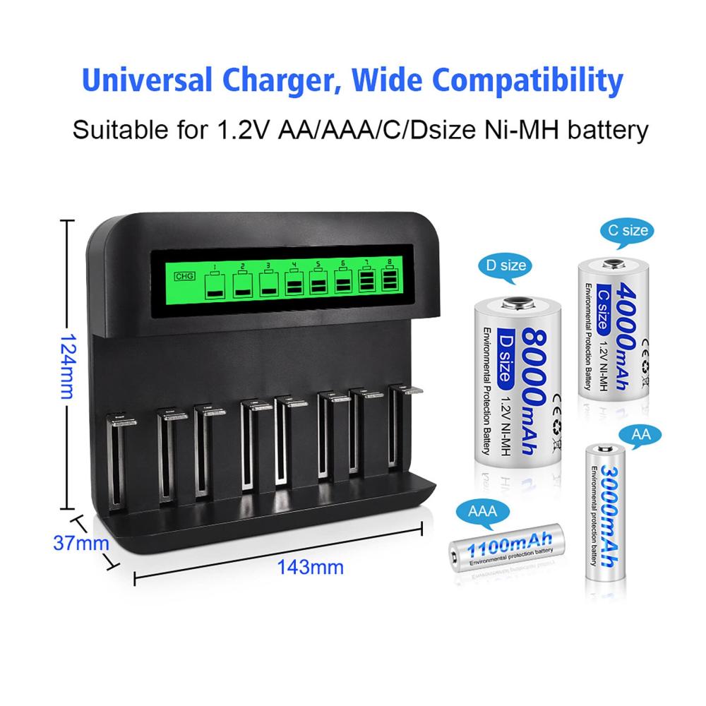 8 einzelne Steckplätze und gemischte Ladefunktion, kann AA, AAA, C und D wiederaufladbare Batterien zur gleichen Zeit aufladen.