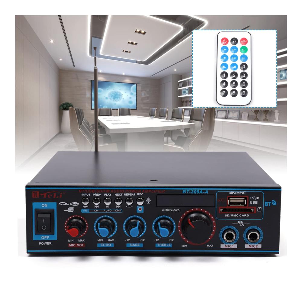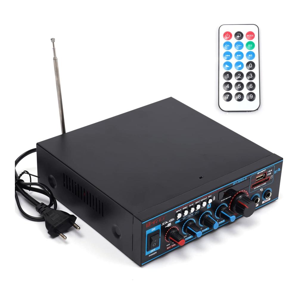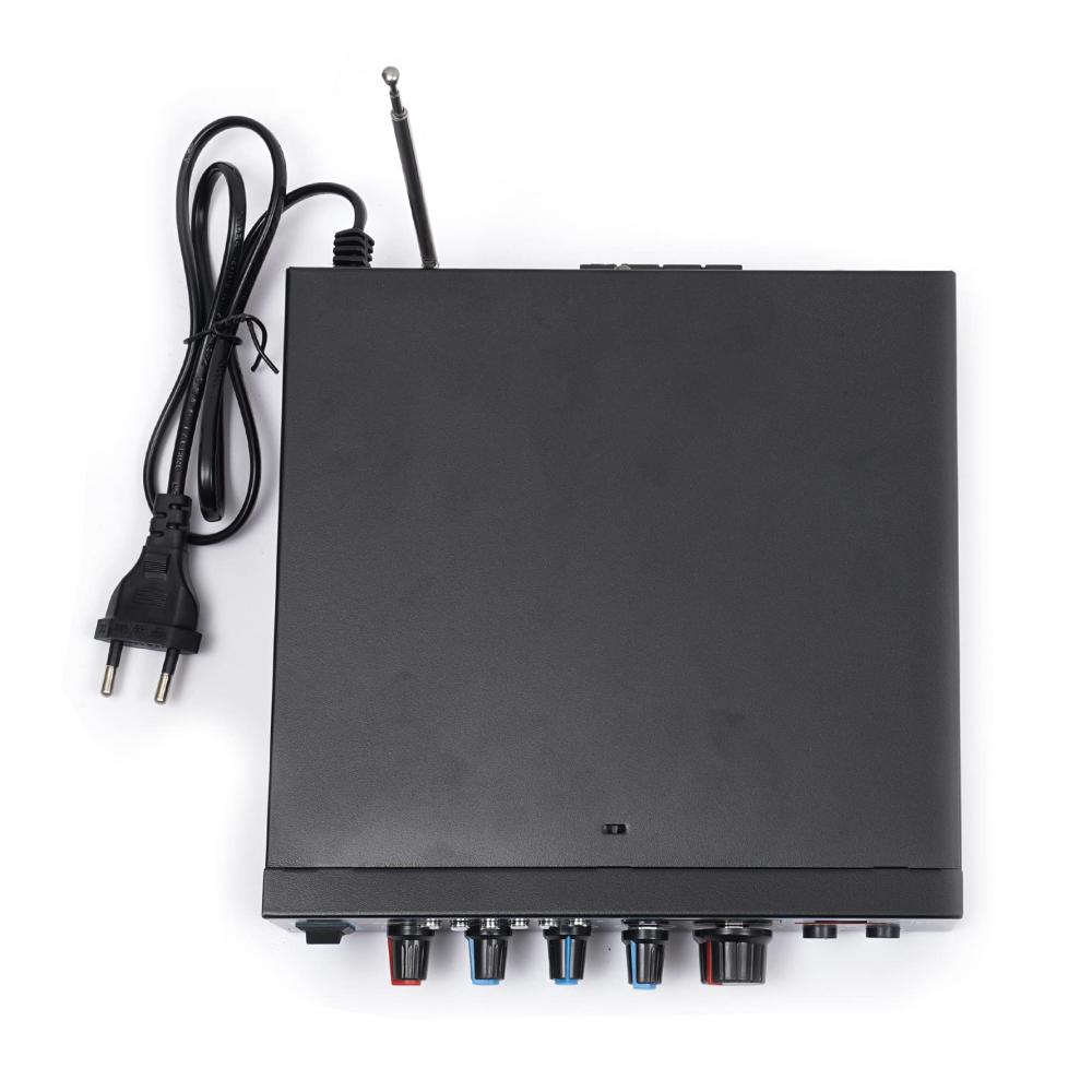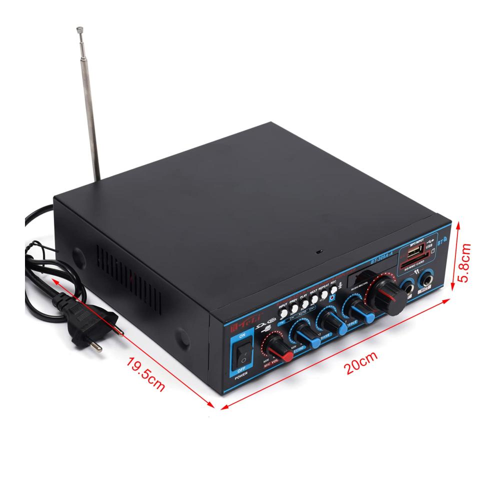 Unser Mini-Hifi-Audioverstärker bietet professionellen Musikgenuss für Zuhause oder unterwegs. Mit Unterstützung für SD-Karten, U-Disk, Bluetooth und MP3-Wiedergabe können Sie Ihre Lieblingsmusik überall genießen. Mit Höhen- und Tiefenregelung für optimalen Klang. Zwei Mikrofoneingänge ermöglichen Karaoke-Spaß. Leicht zu bedienende Tasten und eine Vielzahl von Anschlüssen machen diesen Verstärker vielseitig einsetzbar. Inklusive Fernbedienung und Bedienungsanleitung.