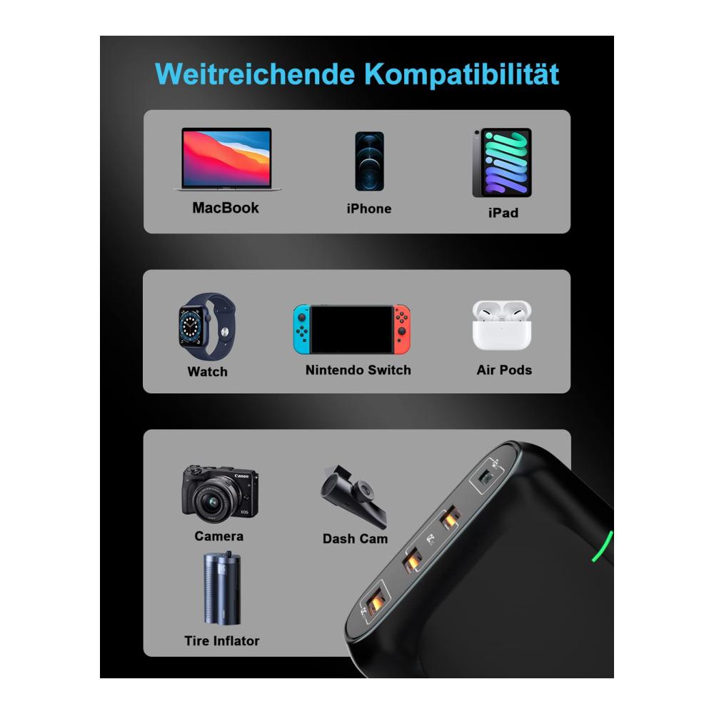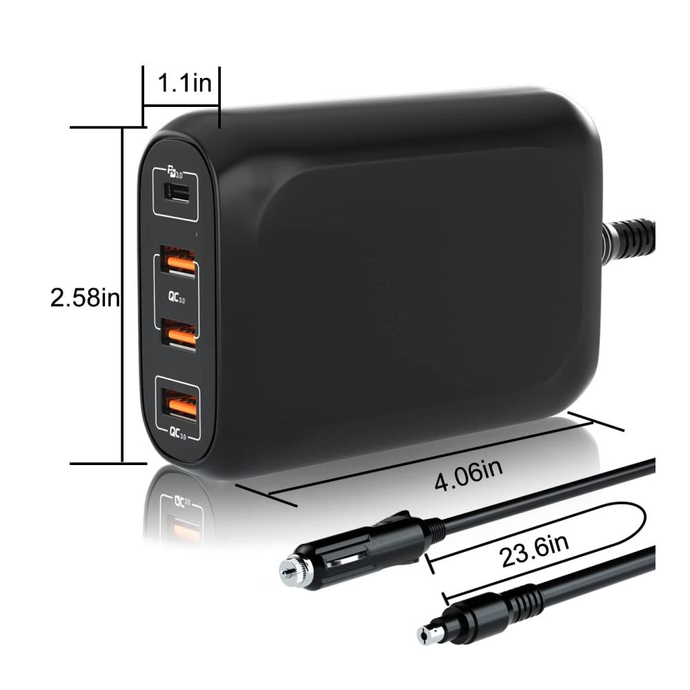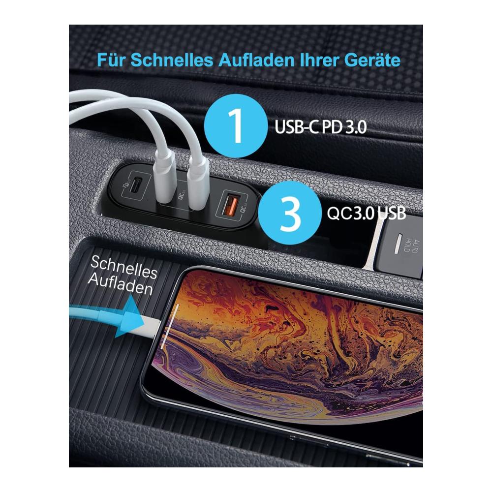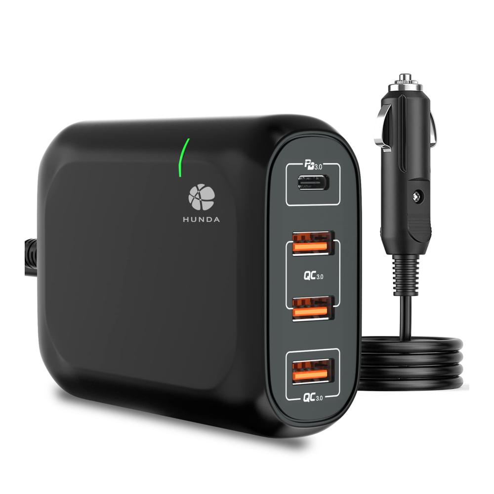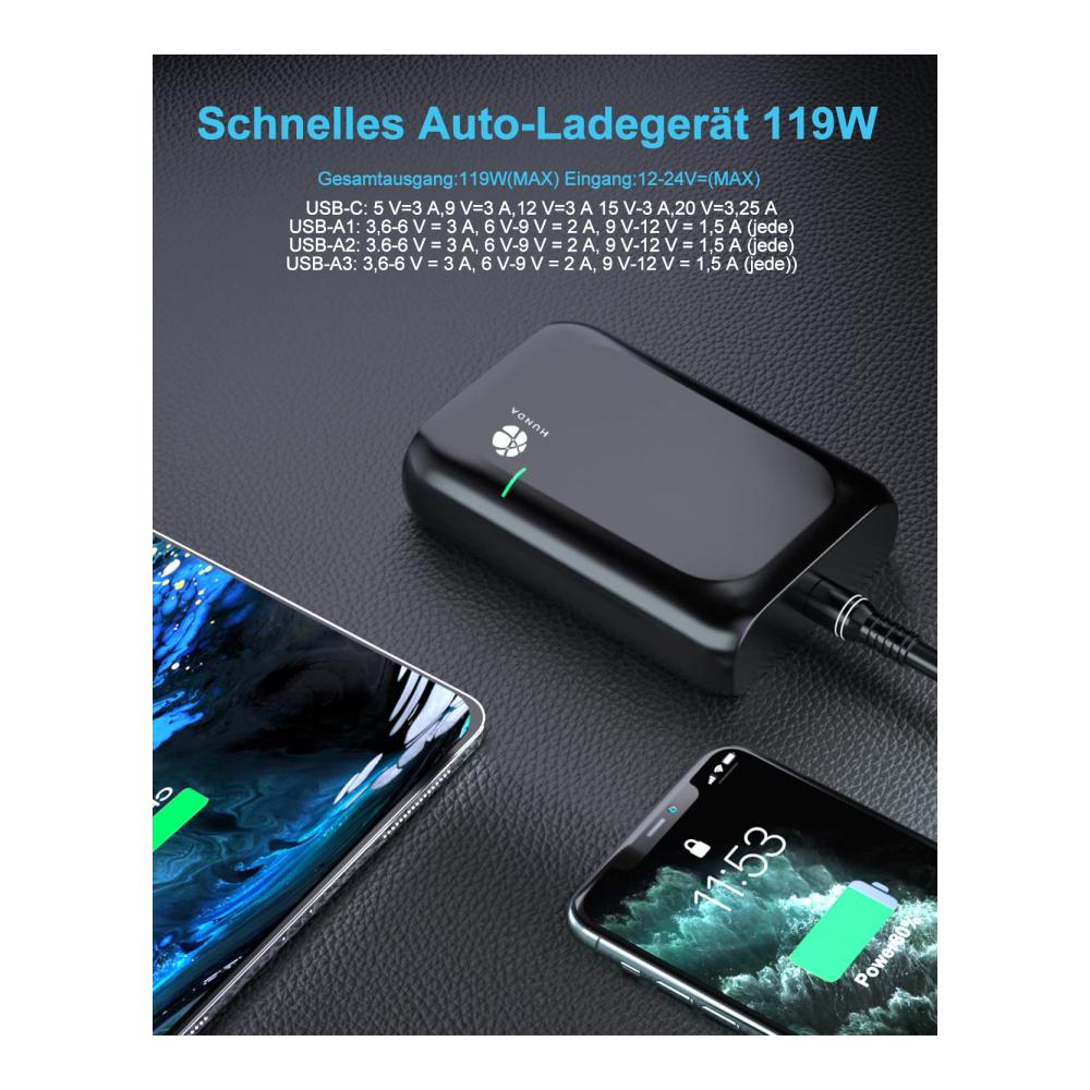 Unser USB C Auto Ladegerät 119W ist mit einem 65W USB-C PD 3.0 Anschluss und einem 54W 3 Port QC3.0 Zigarettenanzünder USB Ladegerät ausgestattet, ideal für iPhone 11/12/Xs/XR/X/8, iPad, Laptop und mehr. Dank seiner umfassenden Kompatibilität passt es zu verschiedenen Fahrzeugen und Geräten. Mit intelligenter Identifikation und Mehrfachschutz garantiert es die Sicherheit Ihrer Geräte. Das Ladegerät wird von HUNDA hergestellt, einem führenden Spezialisten für Laptop-Netzteile und Computer-Peripheriegeräte.