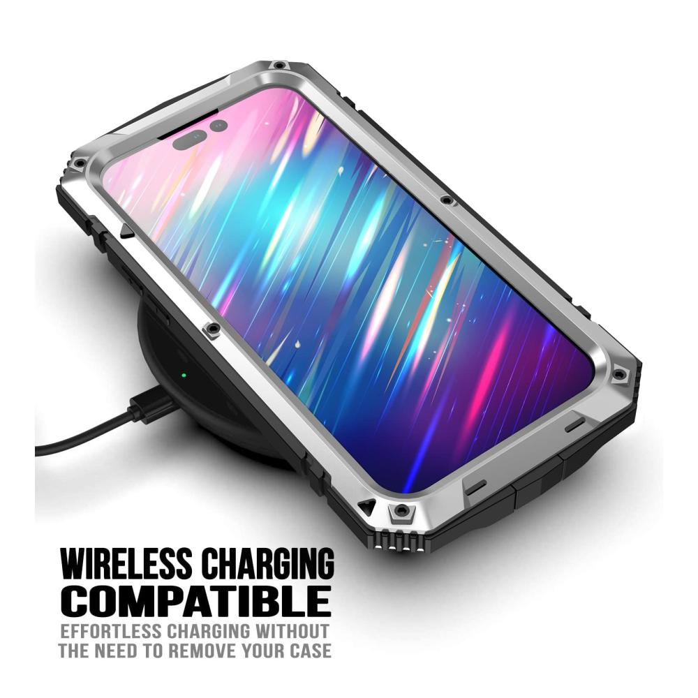 Diese luxuriöse, robuste 360-Grad-Rundumschutz-Schutzhülle aus Metall und Aluminium, stoßfest mit Ständer, ist perfekt kompatibel mit dem iPhone 14 Pro Max (Silber). Das Design besteht aus hochwertigem, weichem TPU und Metallmaterialien, bietet 360-Grad-Dual-Layer-Schutz für Ihr Standard iPhone. Die zweistöckige Architektur gewährleistet Kratzfestigkeit, Fallschutz, Stoßdämpfung und Bruchsicherheit. Wetterfest und sanddicht, ideal für den Strand. Modisches Design für Männer, Soldaten, Outdoor-Enthusiasten und mehr. Unterstützt kabelloses Aufladen. Lieferumfang: 1 x Handy-Schutzhülle, 1 x Montagezubehör.