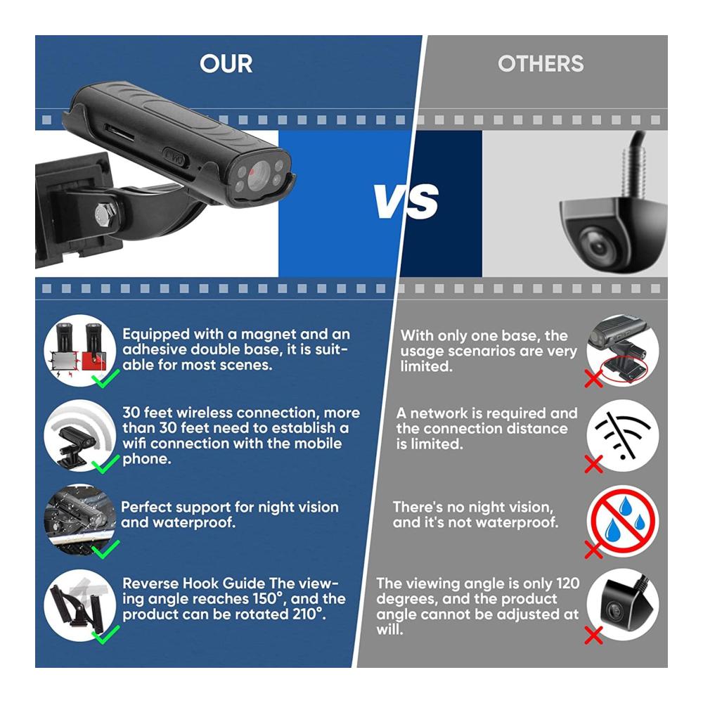 Rückfahrkamera-System:Ausgestattet mit einem 150°-Weitwinkelobjektiv, einem eingebauten Akku und einer stabilen, drahtlosen Übertragungsstrecke von 20 Fuß, die das Manövrieren in engen Räumen erleichtert. Geeignet für Autos, Wohnmobile, Lastwagen, Anhänger, Häuser und mehr. | Wasserdicht:Wasserdicht, so dass Sie es in jeder Umgebung bedenkenlos einsetzen können. | Infrarot-Nachtsicht:Mit ihren 4 Infrarot-LED-Leuchten bietet die magnetische Rückfahrkamera eine hervorragende Nachtsicht, so dass Sie auch bei schlechten Lichtverhältnissen rückwärts fahren können. |