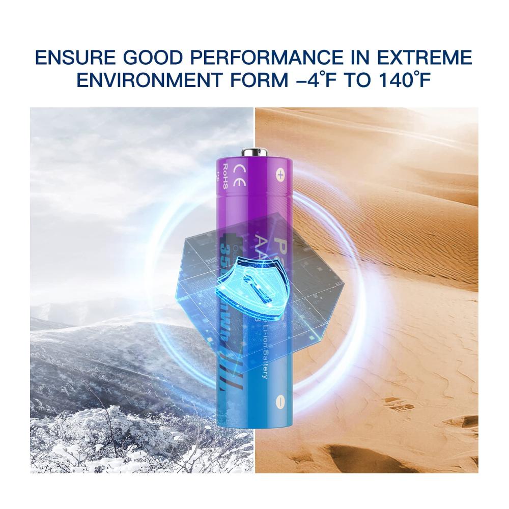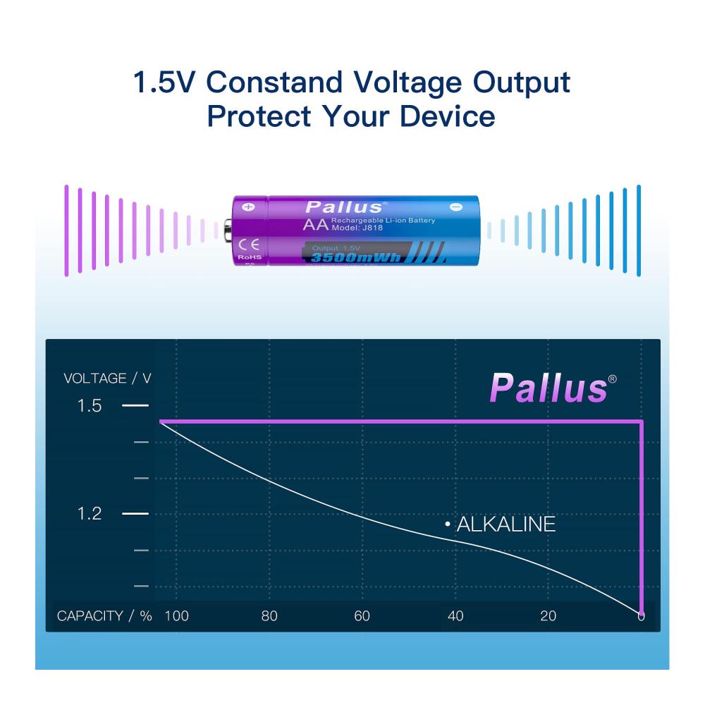 1,5V Konstantausgang: Pallus AA Lithium Akku können ungefähr die gleiche und konstante Spannung von 100 % bis 0 % der elektrischen Kapazität liefern, höher als 1,2V-NiMh-Batterien. Mit 3A max. Ausgangsstrom.