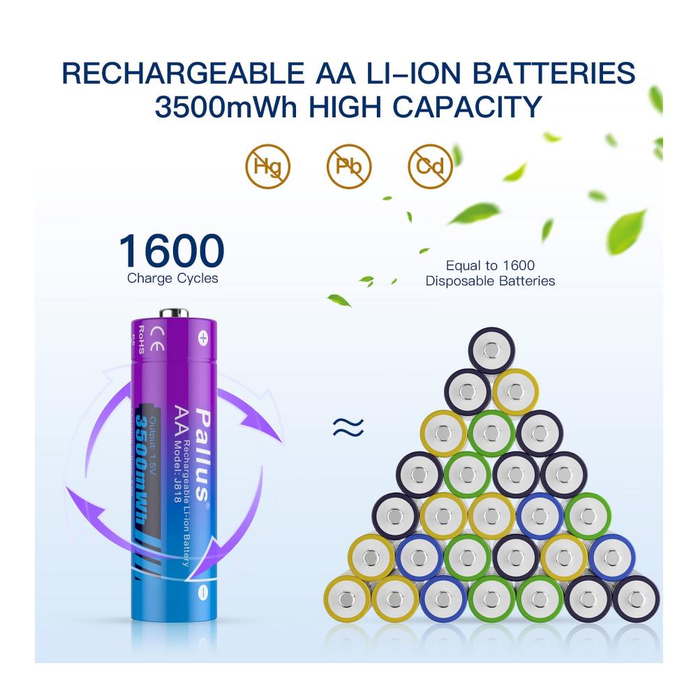 Lange Lebensdauer: 1 Zyklus = 1 Stück Einwegbatterie. Der wiederaufladbare AA Lithium Akku von Pallus kann mit bis zu 1600 Zyklen aufgeladen werden. Verlängern Sie die Zykluszeiten um 45% im Vergleich zu herkömmlichen Batterien. Keine Notwendigkeit, riesige Alkalibatterien zu kaufen und Kosten zu sparen.