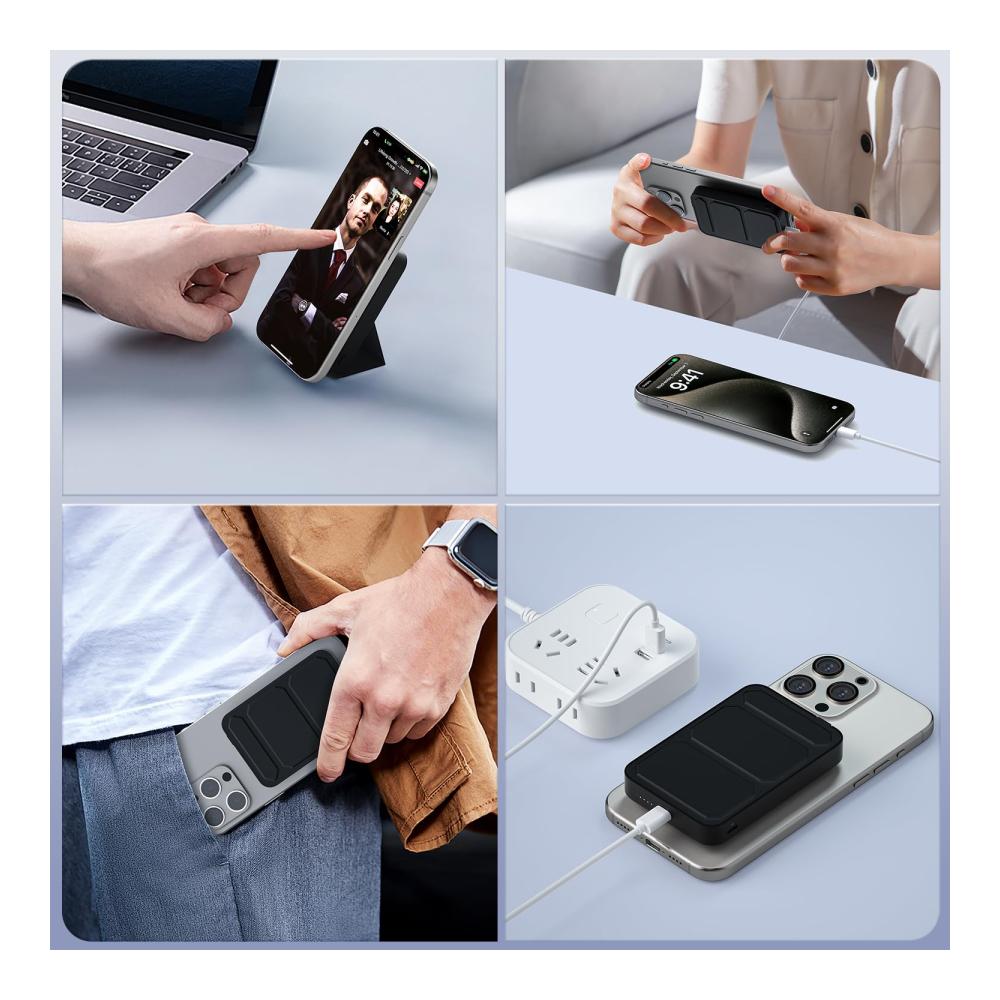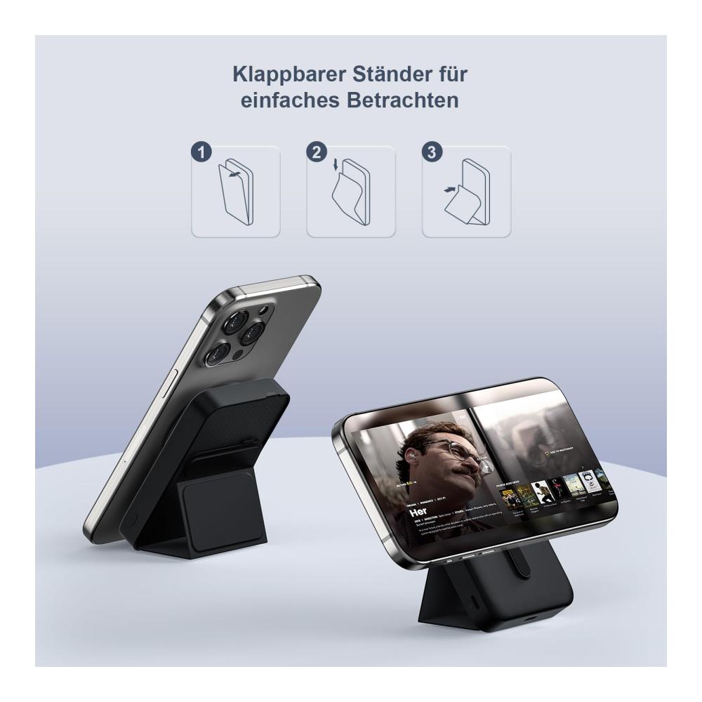 FALTBARER STAND UND TRAGBARES DESIGN – Diese kabellose Wireless Powerbank wird mit einem faltbaren Ständer geliefert, Der verstellbare integrierte Ständer verwandelt deine iphone Powerbank in einen Ständer zum Ansehen von Videos oder FaceTime unterwegs.Nur 200g leicht und tragbar, dünnstes und leichtestes Design, nur die Größe einer Bankkarte.