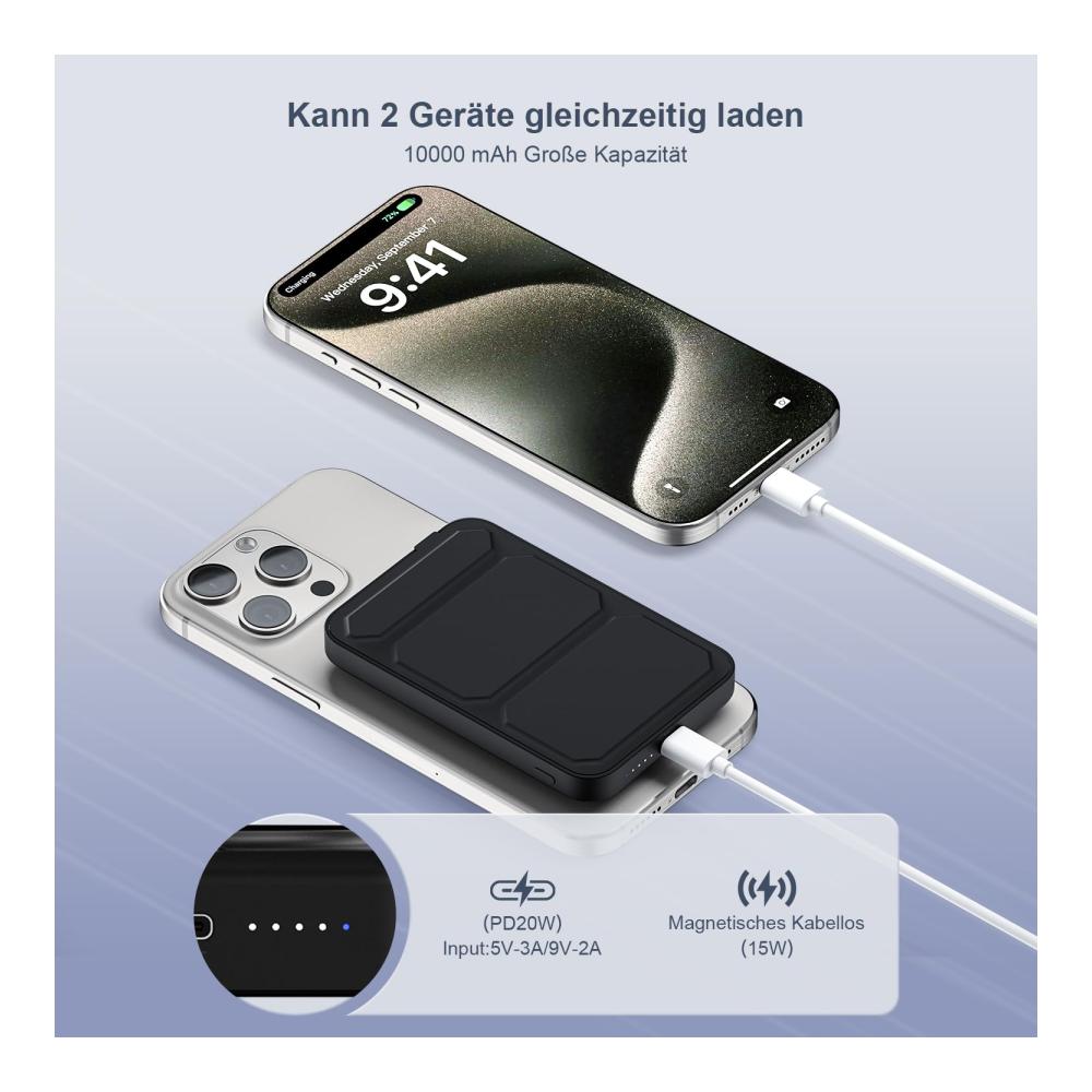 Diese Magsafe Powerbank mit 10000mAh Kapazität ist die ideale Lösung für unterwegs. Mit einem klappbaren magnetischen Design und 20W USB-C Schnellladung ist sie perfekt für iPhones der 15/14/13/12 Serie. Dank ihrer kompakten Größe passt sie problemlos in Ihre Tasche. Holen Sie sich jetzt diese externe Batterie und bleiben Sie immer mit Energie versorgt.