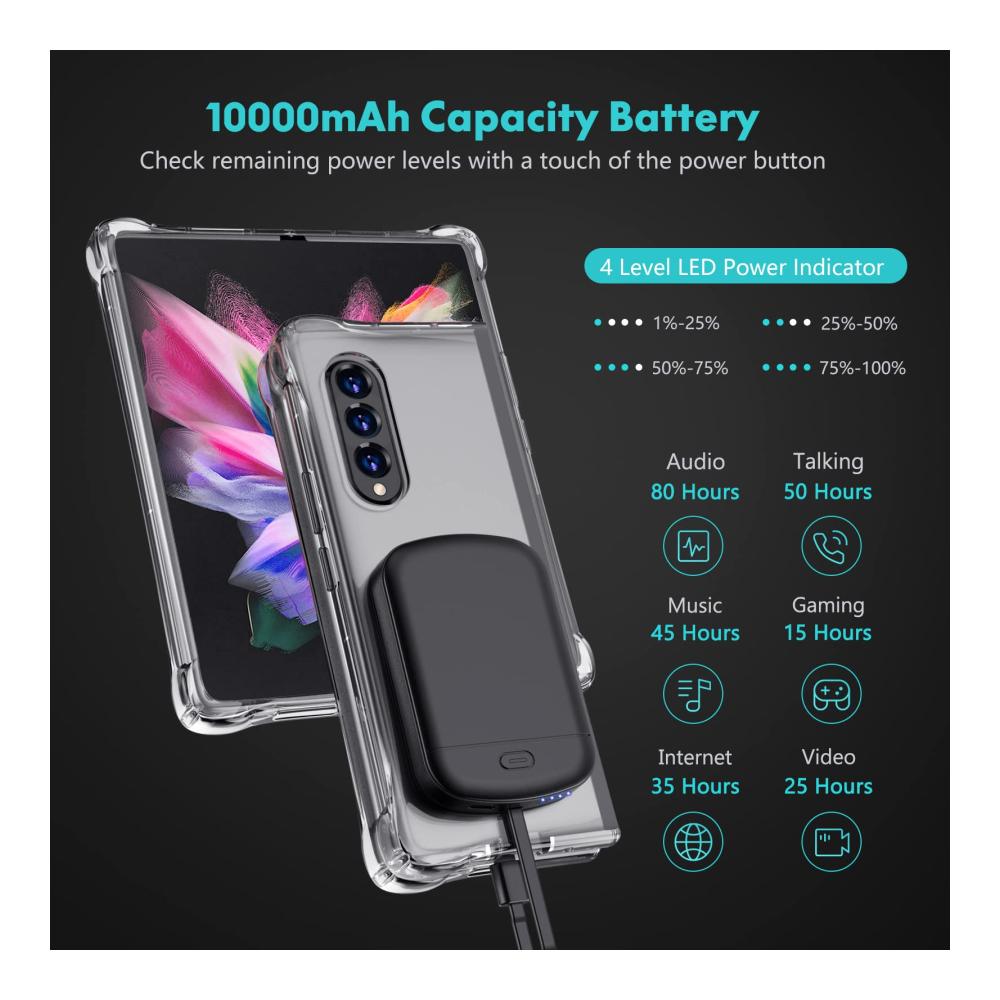 Galaxy Z Fold 3 Akku-Hülle, Taste für 3 Sekunden zum Starten oder Stoppen des Ladevorgangs, LED-Anzeige mit 4 LED-Batteriestandsanzeige zeigt Ihnen genau an, wie viel Leistung Sie haben (25%-50%-75%-100%).