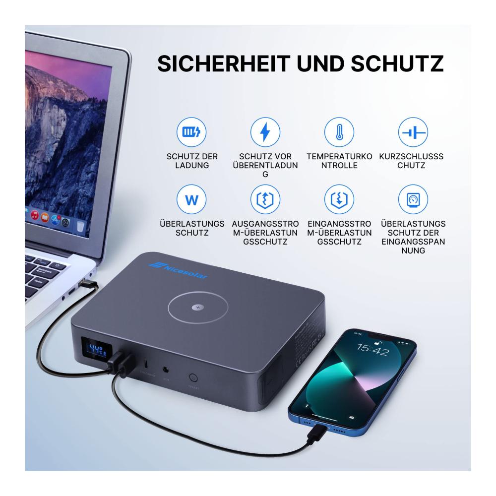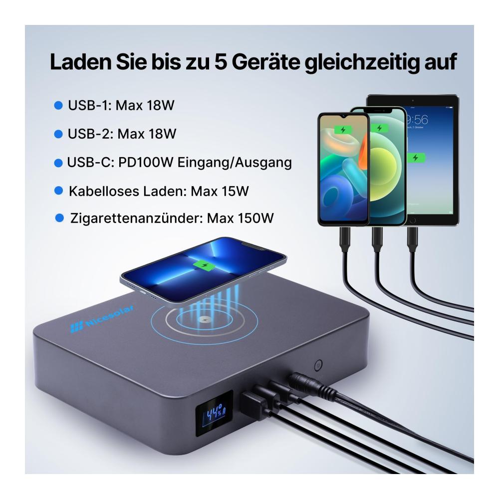 ✅【Leistungsstarker Zugang】Die tragbare Stromstation von Nicesolar ist mit 2 USB-A, 1 USB-C, 1 kabellosen Ladeanschluss und 1 DC-Zigarettenanzünderanschluss ausgestattet, um bis zu 5 Geräte gleichzeitig aufzuladen.