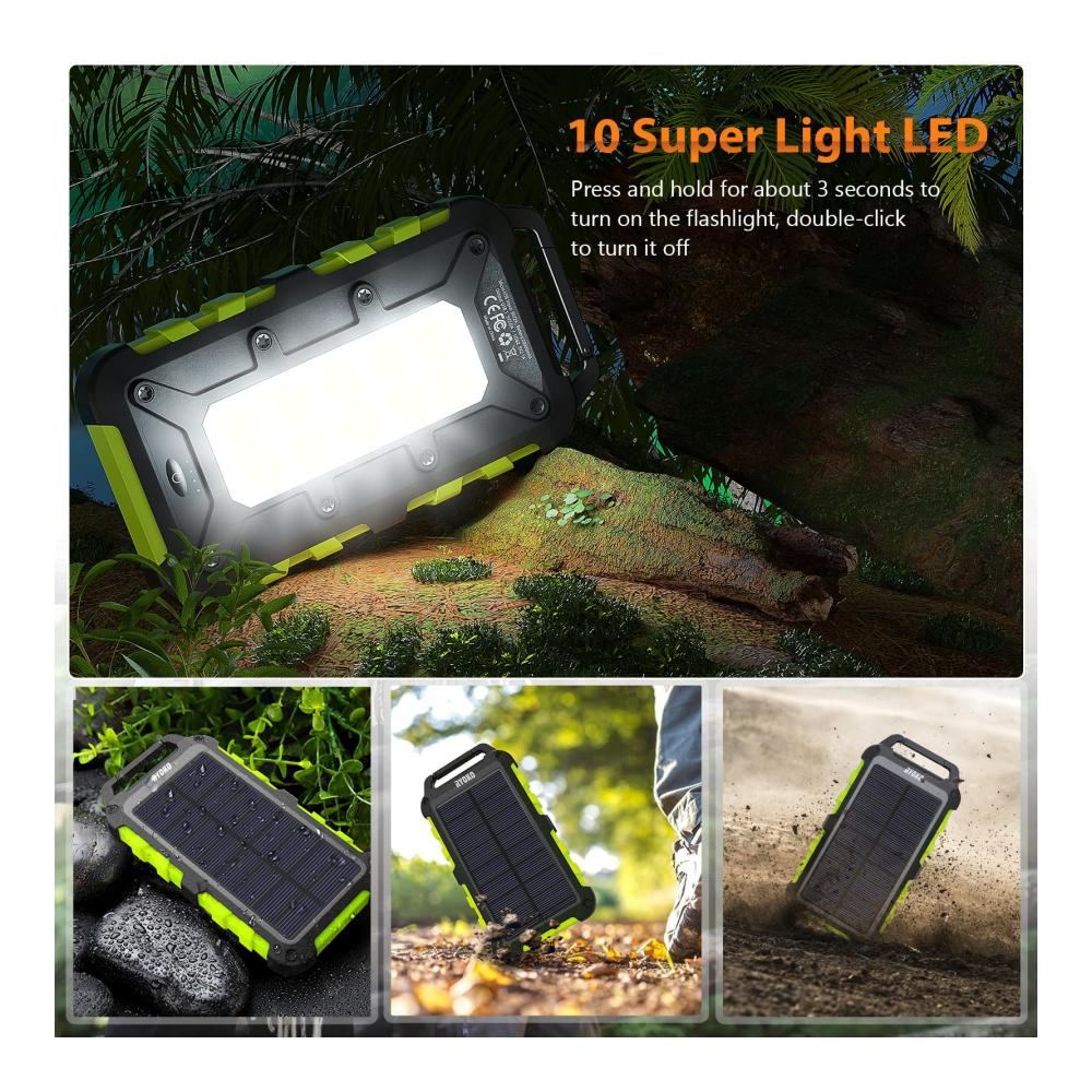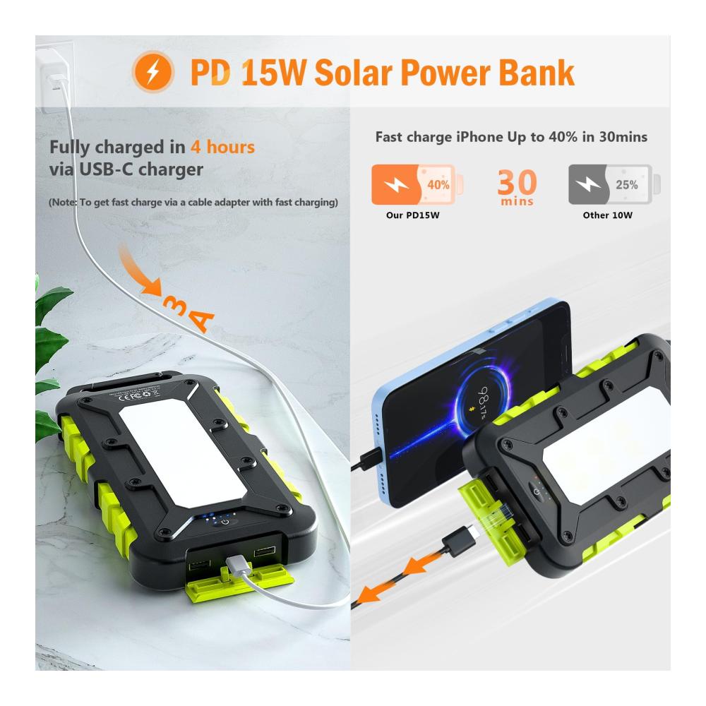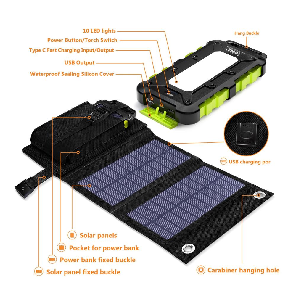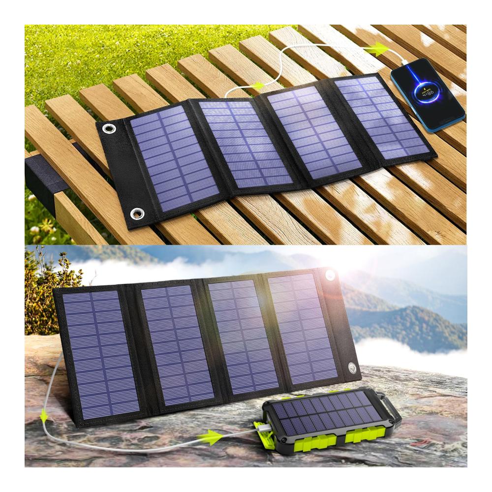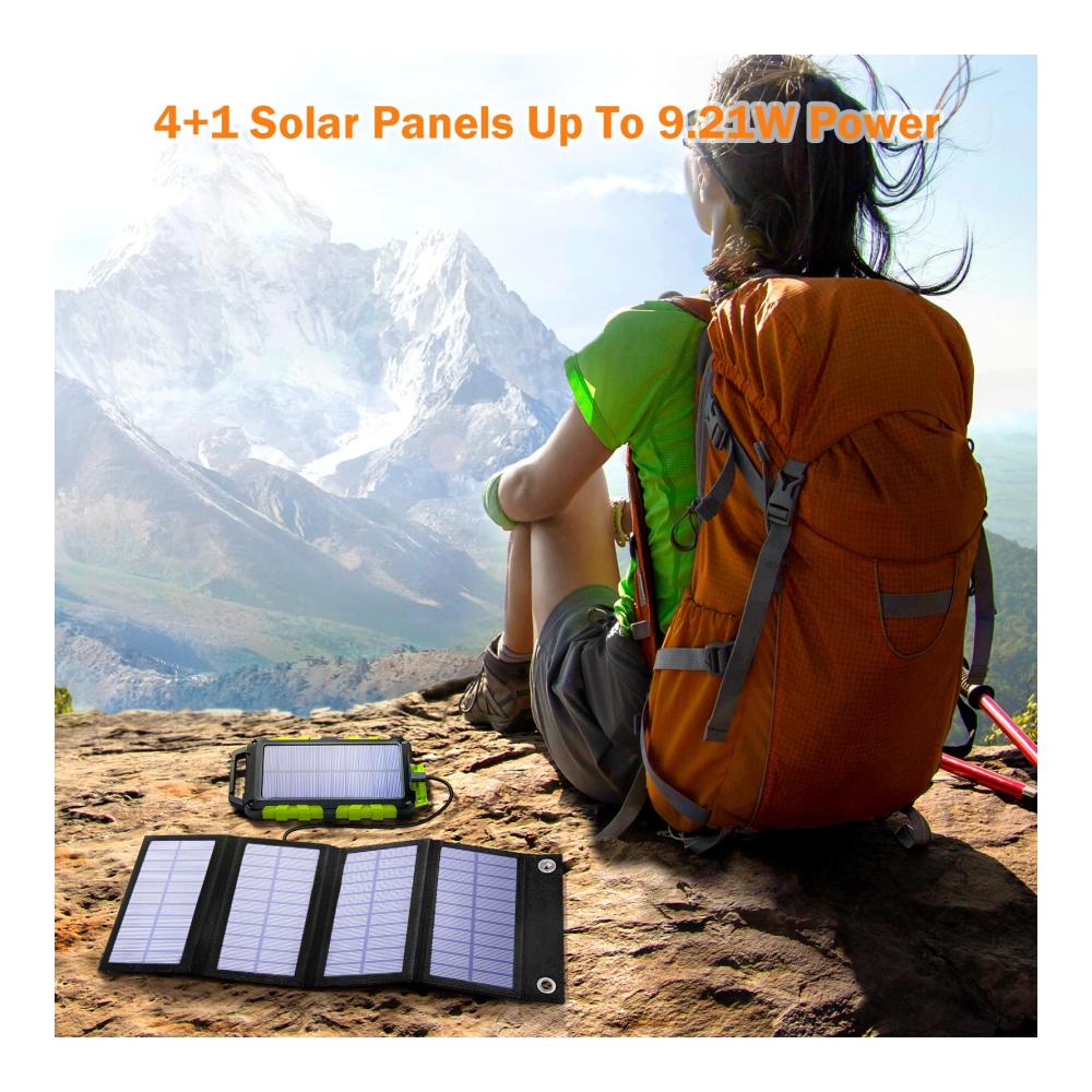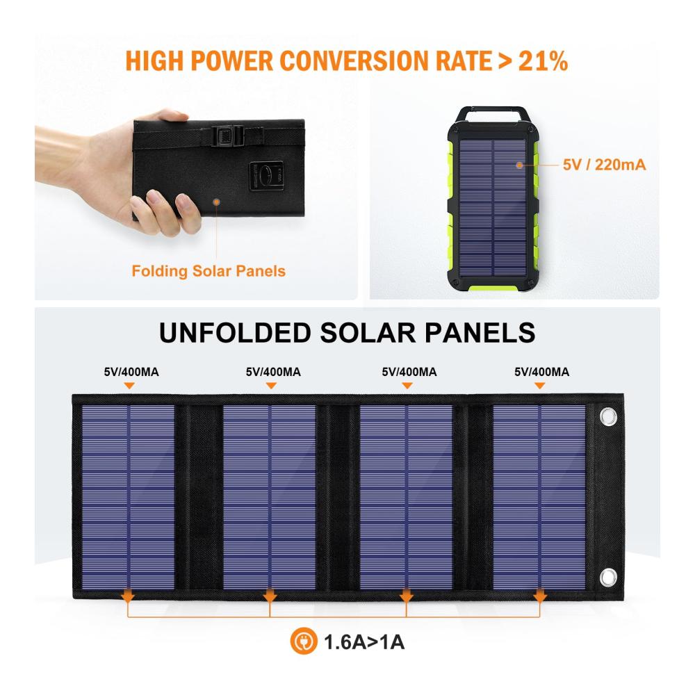 【Solarpanel mit hohem Umwandlungswirkungsgrad】Das 8-W-Solarpanel verwendet hochwertige monokristalline Solarzellen und der Umwandlungswirkungsgrad beträgt bis zu 21 % und es verfügt über einen integrierten 1 USB-Anschluss, über den das Mobiltelefon oder die Powerbank direkt aufgeladen werden kann. (Wenn das 4-fach-Solarpanel nicht zum Aufladen des Mobiltelefons benötigt wird, empfiehlt es sich, ein mobiles Netzteil zur Energiespeicherung anzuschließen) 【7-mal stärkere Solarladung】 Vier hochwertige solarpanel faltbar einen maximalen Strom von 1,6 A erzeugen, um Ihr Gerät aufzuladen. Dies ist siebenmal effizienter als herkömmliche Solarladegeräte mit einem Panel. Verbinden Sie die unterstützende mobile Solarstromversorgung zum Solarladen miteinander, und die maximale Solarladeleistung kann 9,21 W erreichen 【20.000 mAh Powerbank】Die Solar Powerbank ist mit 1 Typ-C-Eingangs-/Ausgangsanschluss (unterstützt 15 W Zwei-Wege-Schnellladung), 2 USB-Ausgängen (2,1 A). Laden über USB-C-Ladekabel/Typ-C-Ladekabel oder Solarpanel (Solarladung ist eine Notfall-Backup-Lösung). Eingebaute 10 ultrahelle LEDs, praktisch für die Nachtbeleuchtung im Freien, Hakendesign, einfach am Rucksack aufzuhängen 【Tragbares Design】Das kompakte Solarpanel lässt sich zum einfachen Transport auf die Größe einer kleinen Brieftasche zusammenfalten (7.13 x 4.25 Zoll zusammengefaltet oder 7.13 × 18.78 Zoll geöffnet). Das Taschendesign des Solarpanels ist praktisch für die Aufbewahrung der Powerbank, und es ist mit zwei Karabinern ausgestattet, was sehr gut geeignet ist Zum Befestigen am Rucksack beim Wandern oder Spazierengehen in der Stadt. 【Outdoor-Begleiter】Das tragbare Design der solar ladegerät und des Solarpanels eignet sich sehr gut für Outdoor-Aktivitäten wie Camping, Wandern, Angeln, Radfahren usw. Machen Sie sich keine Sorgen, dass das Telefon plötzlich keinen Strom mehr hat. Die Powerbank ist auch für den täglichen Gebrauch geeignet Unser WOWMVP 8W Solarpanel mit Solar Powerbank (20000 mAh) ist der perfekte Begleiter für Ihre Outdoor-Abenteuer! Mit hocheffizienten monokristallinen Solarzellen und einem 7-fach stärkeren Ladevorgang ist dieses Solarladegerät ideal für unterwegs. Die integrierte Powerbank bietet 20000 mAh Kapazität und verfügt über verschiedene Anschlussmöglichkeiten, einschließlich USB-C und USB. Zusammengefaltet passt es in jede Tasche und ist mit Karabinern für einfaches Anbringen am Rucksack ausgestattet. Genießen Sie die Freiheit der Solarenergie, egal wo Sie sind