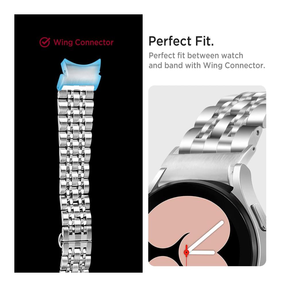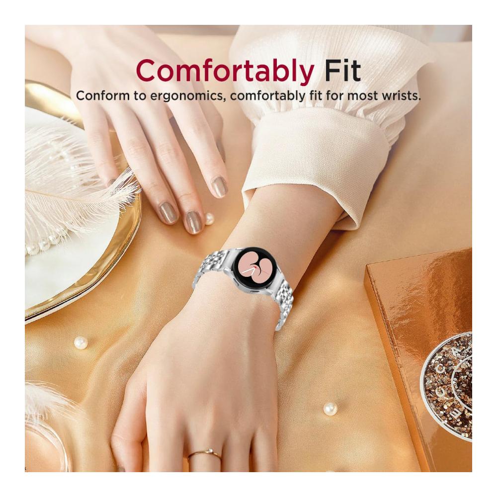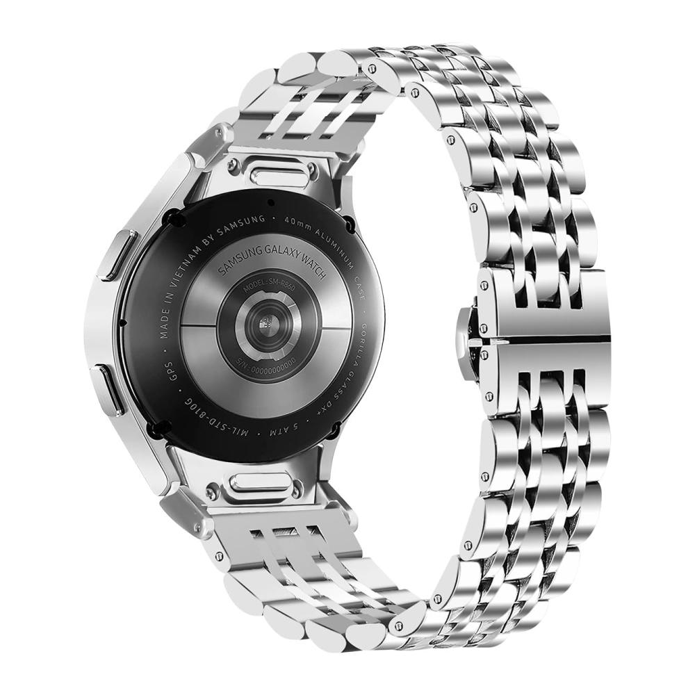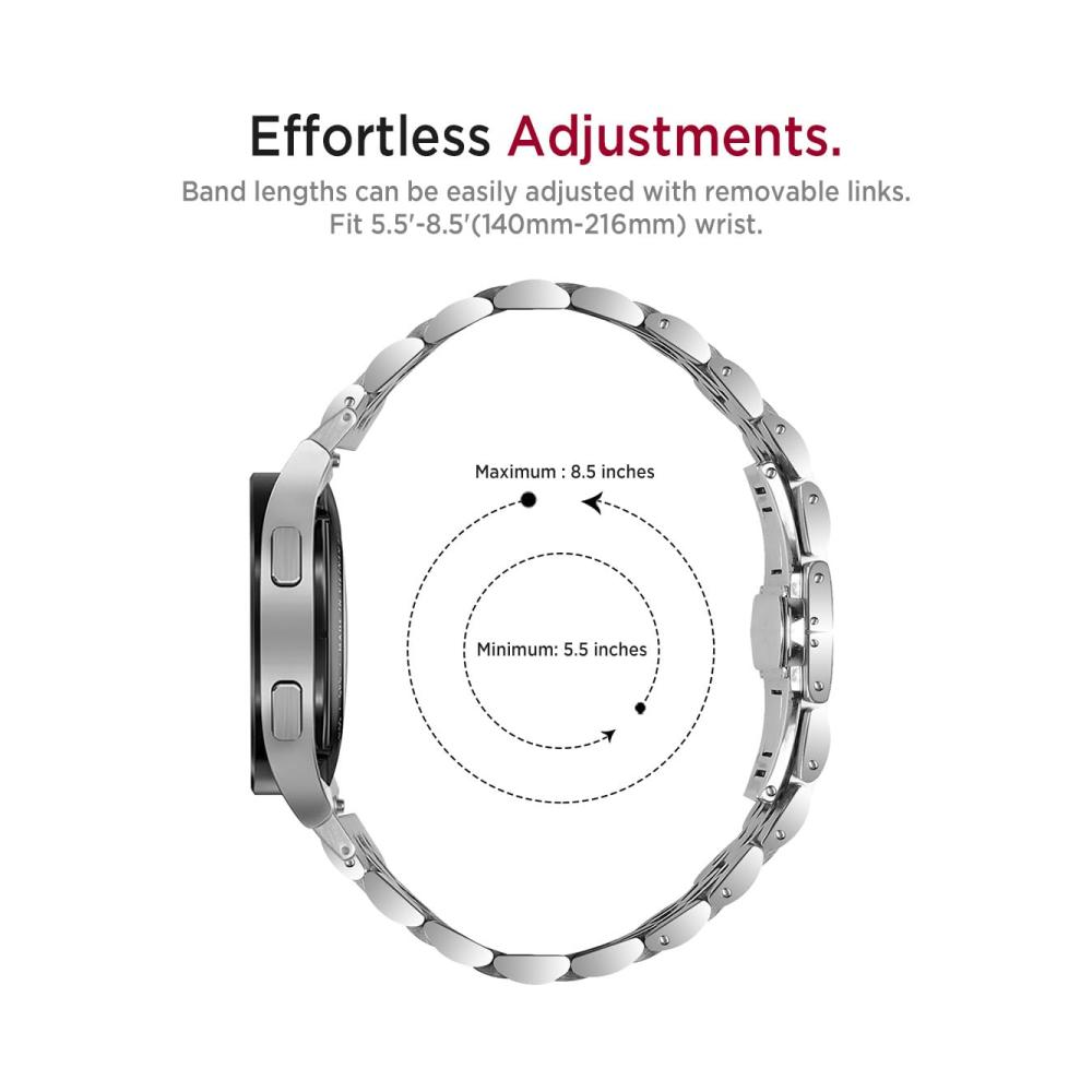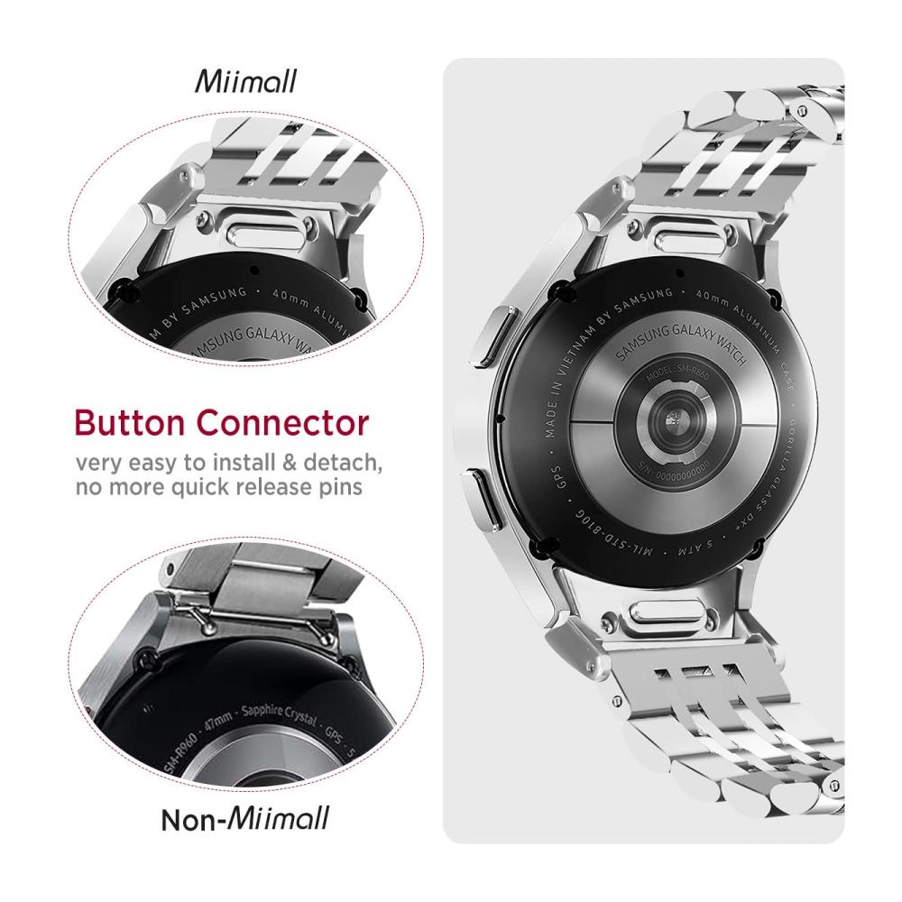 Das Miimall Metall Armband ist perfekt kompatibel mit Samsung Galaxy Watch 6, 5 und 4 in den Größen 40mm und 44mm. Das Armband ist aus hochwertigem Edelstahl gefertigt und verfügt über eine Schmetterlingsschnalle für einfaches An- und Ausziehen. Es ist ein verstellbares Ersatzarmband für die Galaxy Watch 6 Classic in 43mm und 47mm sowie die Watch 5 Pro in 45mm.