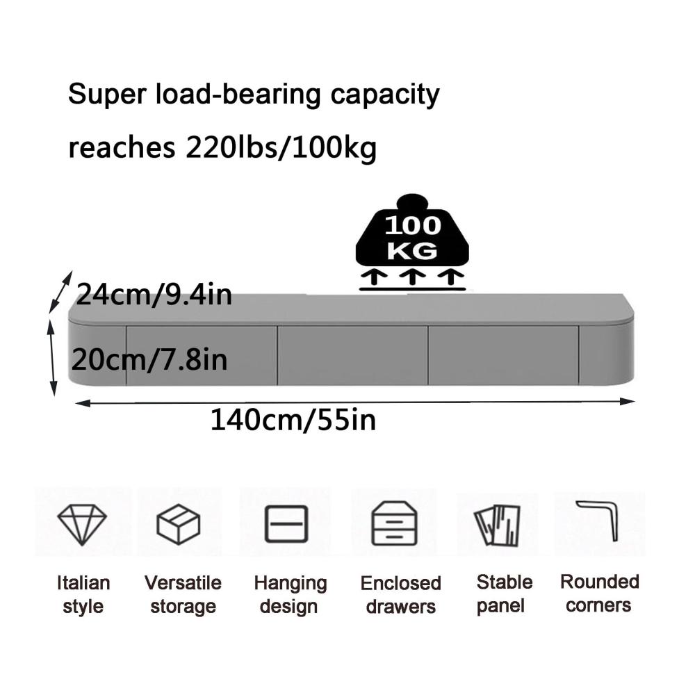 Entworfen mit einer modernen Ästhetik, ist dieser schwebende TV-Schrank perfekt für Ihr Wohnzimmer, Schlafzimmer oder jeden anderen Raum, in dem Sie Ihren Fernseher und Mediengeräte präsentieren möchten. Merkmal: — Der 47-71-Zoll-TV-Ständer ist schwimmend und bietet Platz für Fernseher bis zu 85 Zoll und ist somit eine vielseitige Wahl für verschiedene Fernsehgrößen. — Das elegante graue Eichen-Finish verleiht jedem Raum einen Hauch von Raffinesse und bietet gleichzeitig eine neutrale Kulisse für Ihre Mediengeräte. — Dieser schwebende TV-Ständer zur Wandmontage ermöglicht es Ihnen, ihn auf der perfekten Betrachtungshöhe zu platzieren und Ihr Seherlebnis zu verbessern. — Sie können es verwenden, um Ihre Lieblingsfotos, Bücher oder Dekorationsartikel zu präsentieren, was es zu einer vielseitigen Ergänzung für Ihr Zuhause macht. Die schwebende TV-Konsole ist mehr als nur ein TV-Ständer für Ihr Schlafzimmer oder Wohnzimmer. Es ist ein komplettes Unterhaltungssystem, das eine Plattform für Ihren Fernseher, eine Speicherlösung für Ihre Mediengeräte und ein dekoratives Element für Ihr Zuhause bietet. Besonderer Hinweis: Der untere schwebende Rahmen des Fernsehers unterstützt keine direkte Platzierung des Fernsehers. Die Tragfähigkeit des hängenden TV-Rahmens kann 220 Pfund erreichen Hinweis: 1. Über die Verkaufsliste