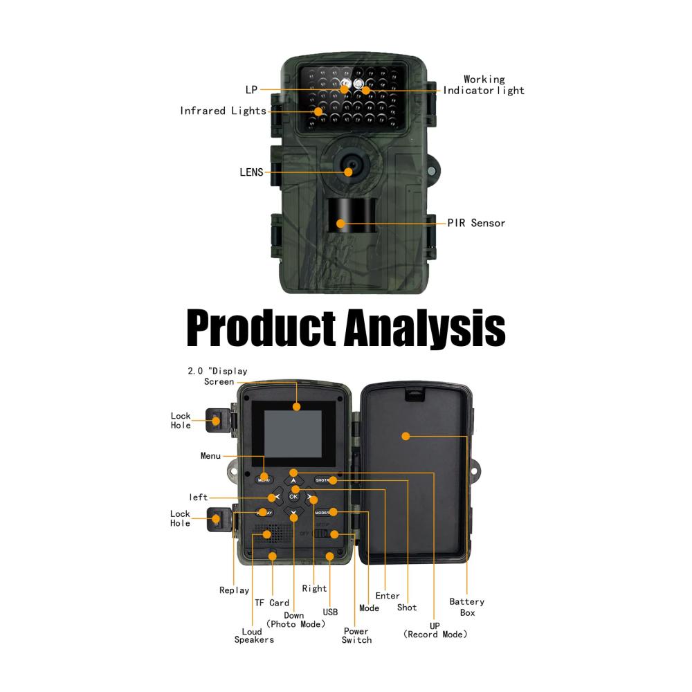 Material des Gehäuses: ABS-Kunststoff. Batterielebensdauer: 6-8 Monate Pixelbereich: 32 MP, 30 MP, 24 MP. Lieferumfang: Kamera, Farbbox, Handbuch, Bandage, USB-Kabel, DC-Kabel. Produktgröße: 140 x 98 x 73 mm. LCD-Bildschirmgröße: 2.0 Speichermedium: TF-Speicherkarte