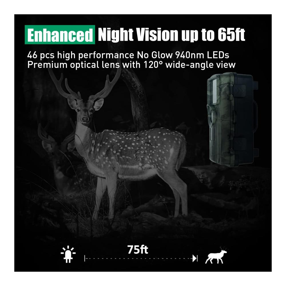 ▶【46 Stück IR-LEDs】Die Jagdkamera ist mit 46 verbesserten 940nm unsichtbaren Infrarotlichtern ausgestattet, um Ihre Kamera während der Aufnahme und Aufnahme versteckter und unsichtbarer zu machen, einschließlich adaptiver Beleuchtungstechnologie, um Überbelichtung oder Überdimmung zu vermeiden, bietet eine helle Nachtsicht bis zu 20 m.
