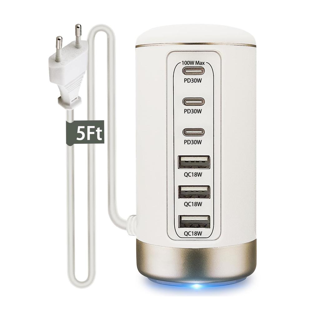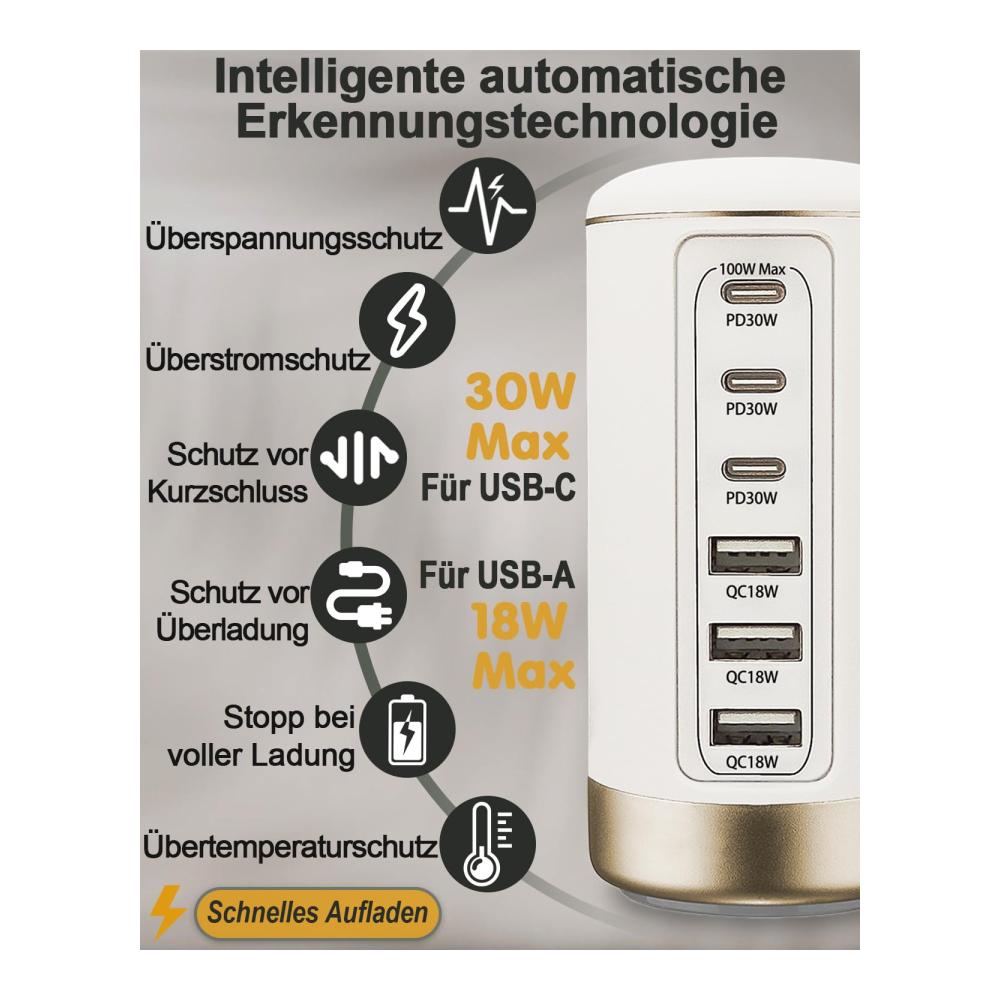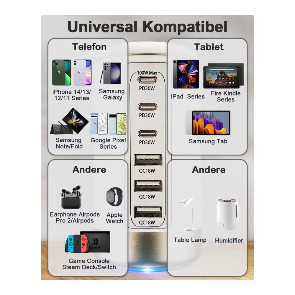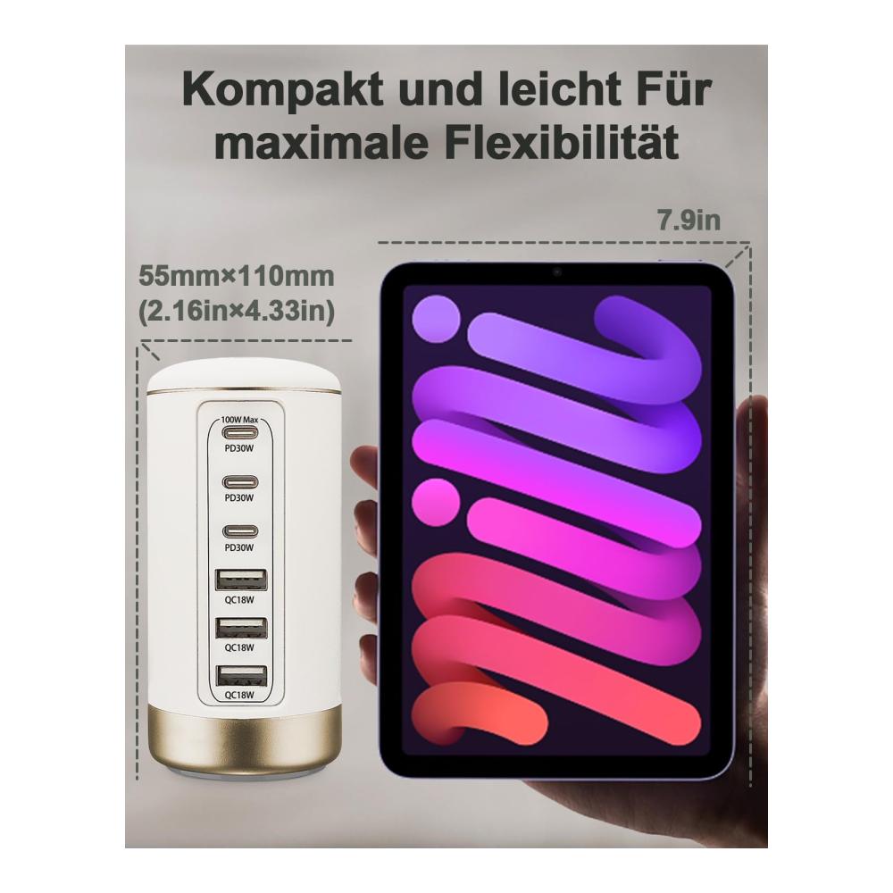 Hochgeschwindigkeits-Ladestation für alle Ihre Geräte: Wir stellen unsere 100 Watt Ladestation mit GAN Technologie vor. Mit 3 leistungsstarken 30W USB C Power Delivery Anschlüssen können Sie die neuesten iPhone Serien, iPad Pro, Galaxy, Pixel und mehr bis zu dreimal schneller aufladen als mit Standard-Ladegeräten. Genießen Sie außerdem den Komfort von 3 zusätzlichen 18W USB A Schnellladeanschlüssen für Ihre anderen Gadgets.