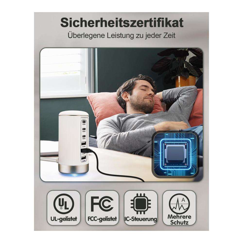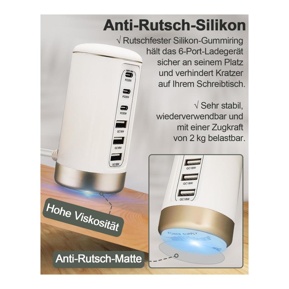 Bequemlichkeit und PortabilitätDie kompakte Größe der USB-Ladestation macht diesen Mehrfach-USB-Ladekonzentrator zum idealen Reisebegleiter. | 1,5 m langes KabelDank des 1,5 m langen Kabels können Sie es in einem ausreichenden Radius verwenden, ohne befürchten zu müssen, dass die Steckdose zu weit entfernt ist. | Rutschfeste, selbstklebende TPU-BasisDie wiederverwendbare, klebrige und rutschfeste TPU-Basis hält die Ladesäule fest auf dem Schreibtisch, sodass Sie sich keine Sorgen um das Verschieben machen müssen. |