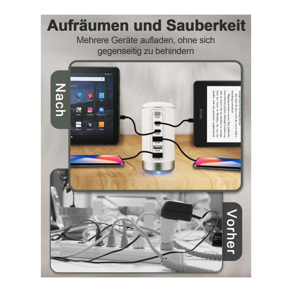 Sechs-in-Eins-Ladekomfort: Vereinfachen Sie Ihr Lade-Setup mit unserem vielseitigen Lade-Hub. Mit 3 USB-C Power Delivery-Anschlüssen und 3 USB-A-Anschlüssen können Sie bis zu sechs Geräte gleichzeitig aufladen. Egal ob Sie zu Hause oder unterwegs sind, das verlängerte Netzkabel sorgt dafür, dass Sie immer verbunden sind.