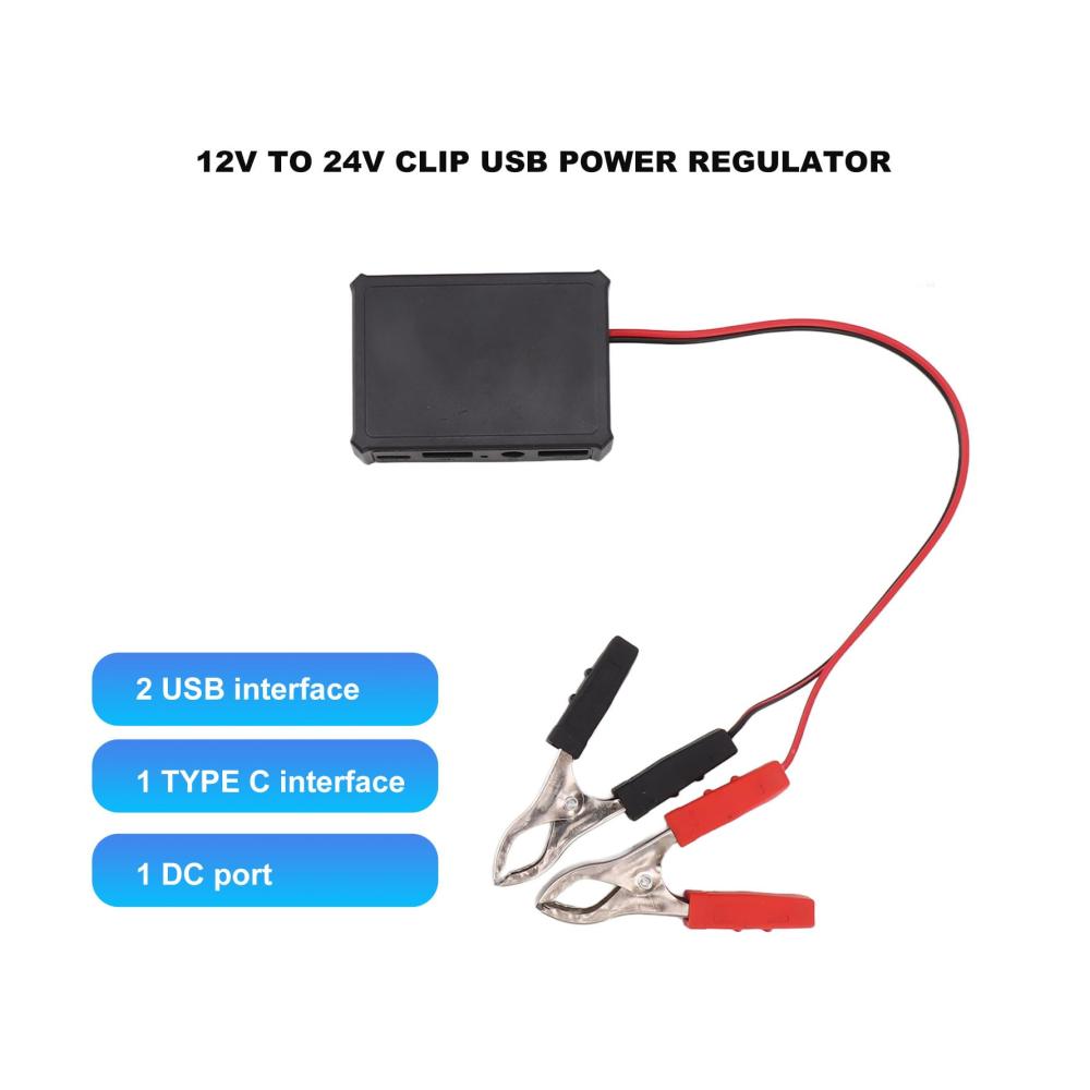 12-Volt-zu-USB-Adapter – 12 V auf 24 V Krokodilklemmen-Unterstützung, schnelles Aufladen, USB-Spannungsregler-Clip für TelefonkameraArtikeltyp: 12 V auf 24 V USB-Clip-AnschlussMaterial: ABSSpannungsreglerschnittstelle: 2 x USB-Schnittstelle. 1 x TYP-C-Schnittstelle. 1 x GleichstromanschlussBatterieclip: Kann eine 12-V- bis 24-V-Batterie oder ein Solarpanel anschließenUSB-Anschluss: Kann ein 5-V-Telefon oder ein 12-V-Notebook ausgebenGewicht: Ca. 62 g / 2,2 UnzenPaketliste:1 x12 V bis 24 V Clip-USB-Stromregler