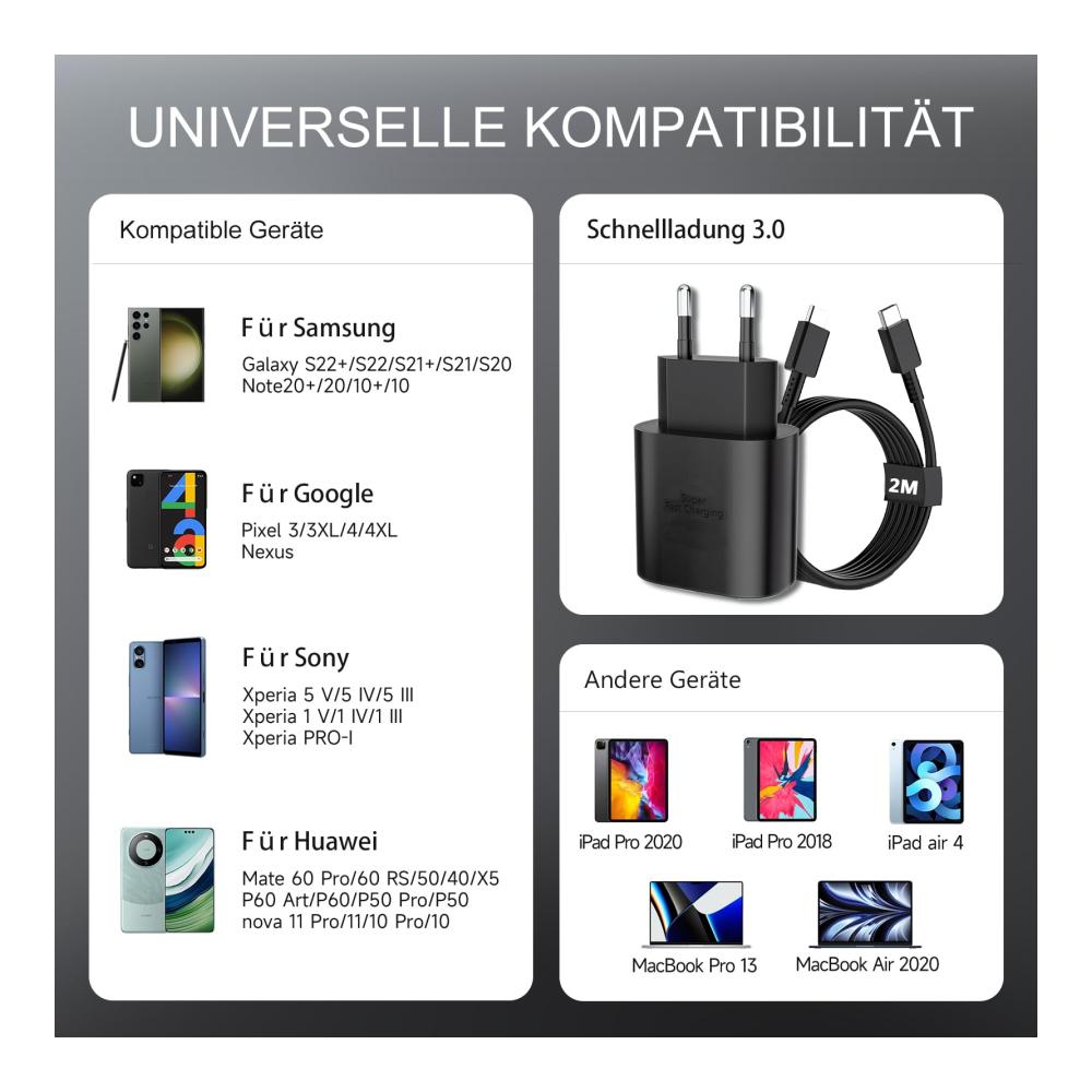 ⚪Im Lieferumfang enthalten: 1 * 25 W USB-Schnellladegerät,1 * 2 m 5 A C-auf-C-Schnellladekabel. Unser Team ist bestrebt, Ihre Zufriedenheit zu gewährleisten und steht Ihnen bei allen Fragen und Anliegen jederzeit zur Verfügung. Bei Qualitätsproblemen wenden Sie sich bitte an uns.