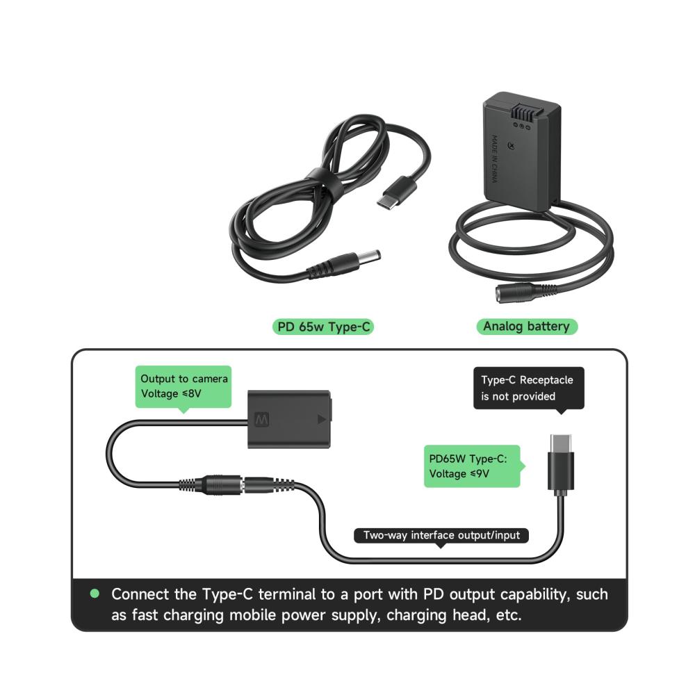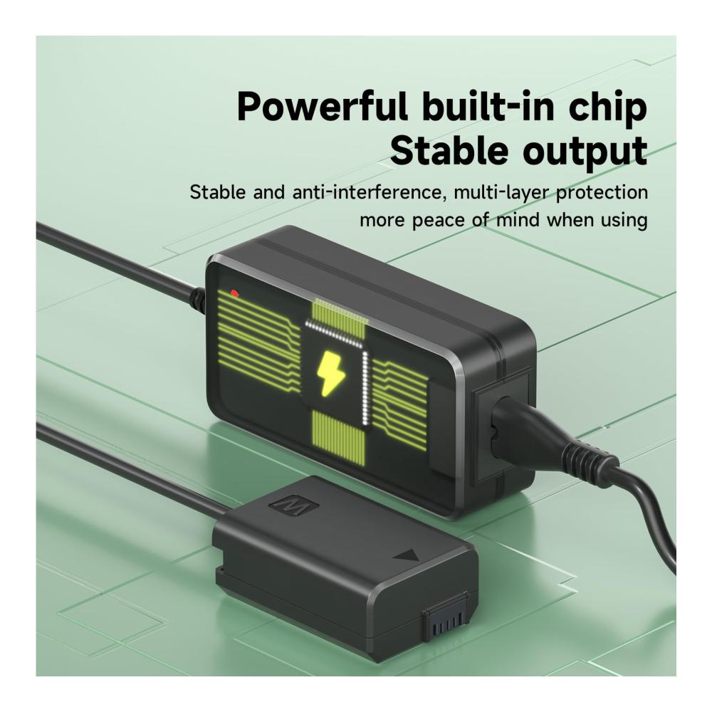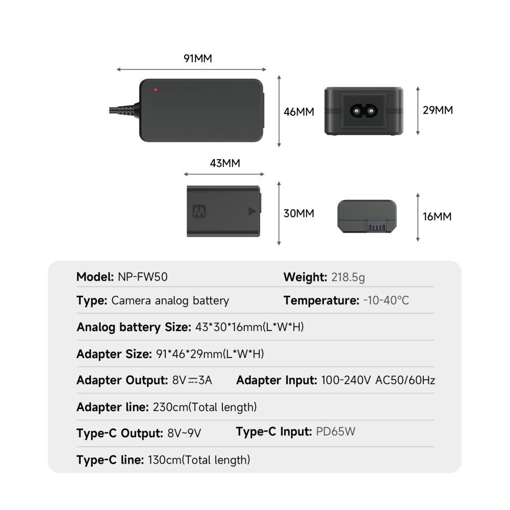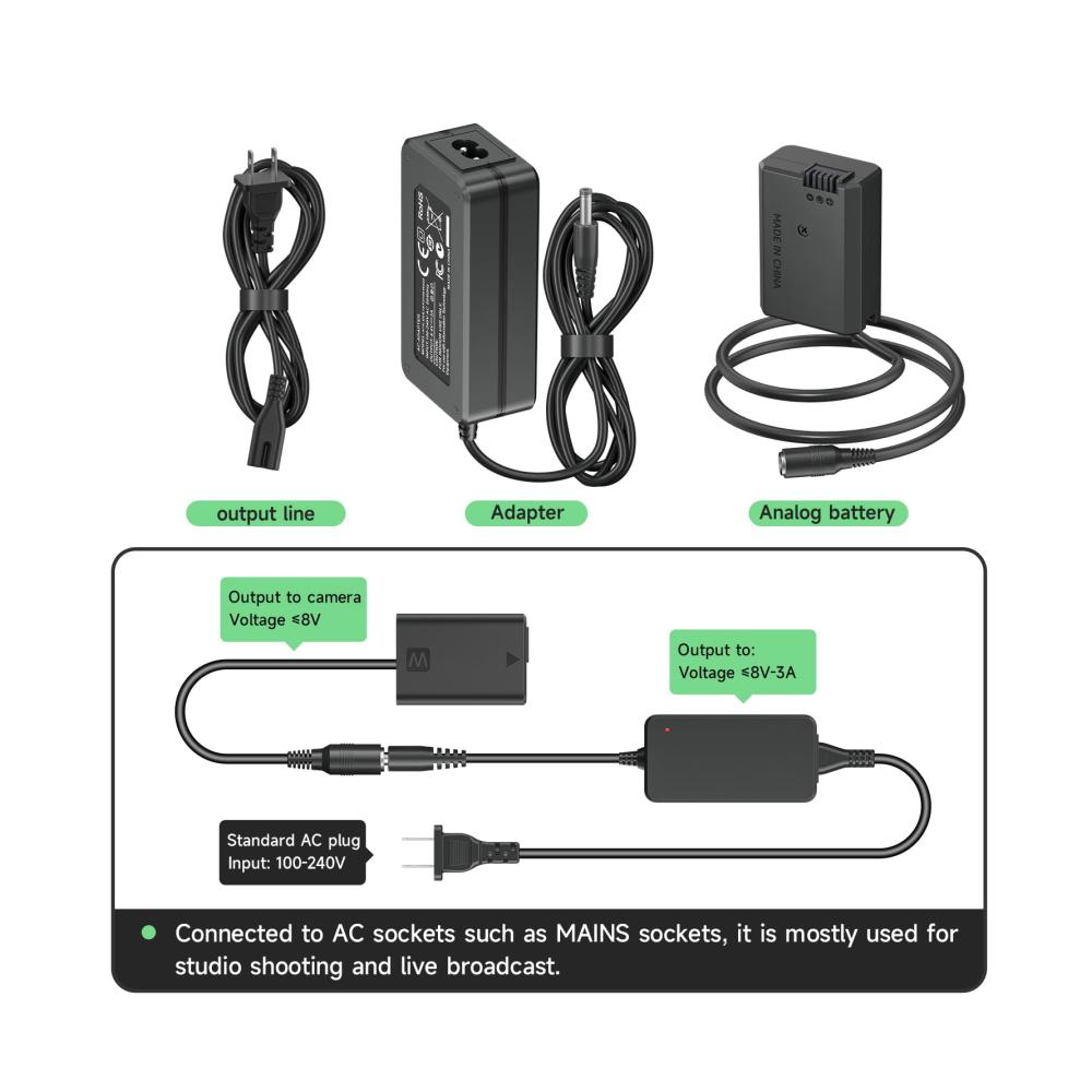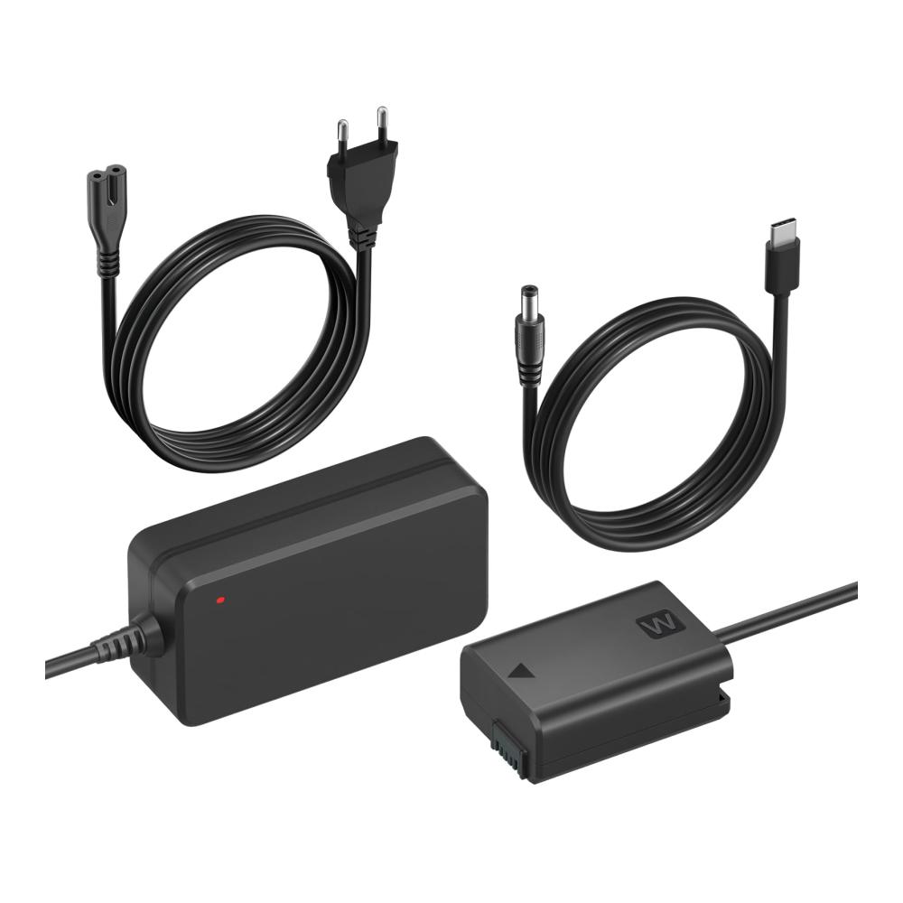 Das NP-FW50 Dummy Akku Kit AC-Netzteiladapter bietet konstante Stromversorgung für Sony Alpha A6000 A5100 A6100 A6300 A6500 A7 A7II A7S A7SII RX10 II IV Kameras. Dieses Adapter Set versorgt Ihre Kamera konstant mit Strom, lädt den Akku jedoch nicht auf.