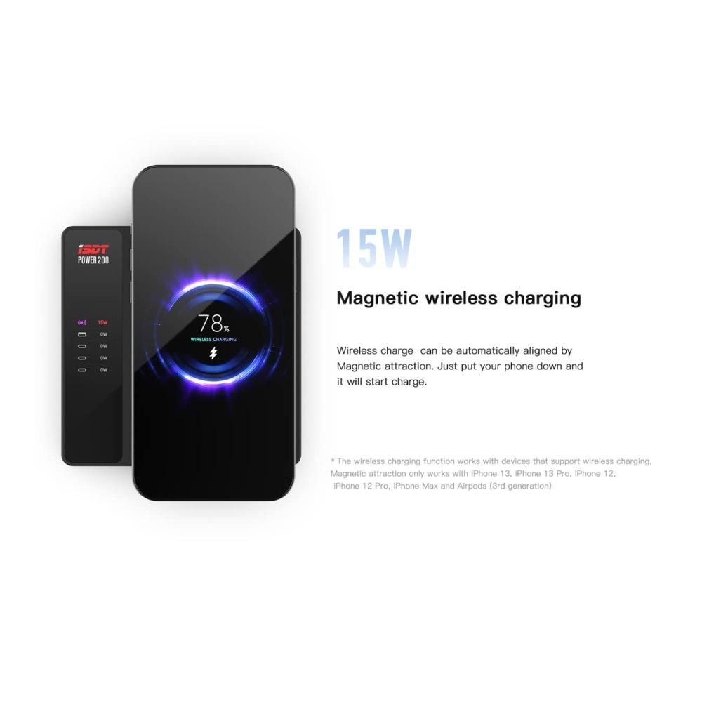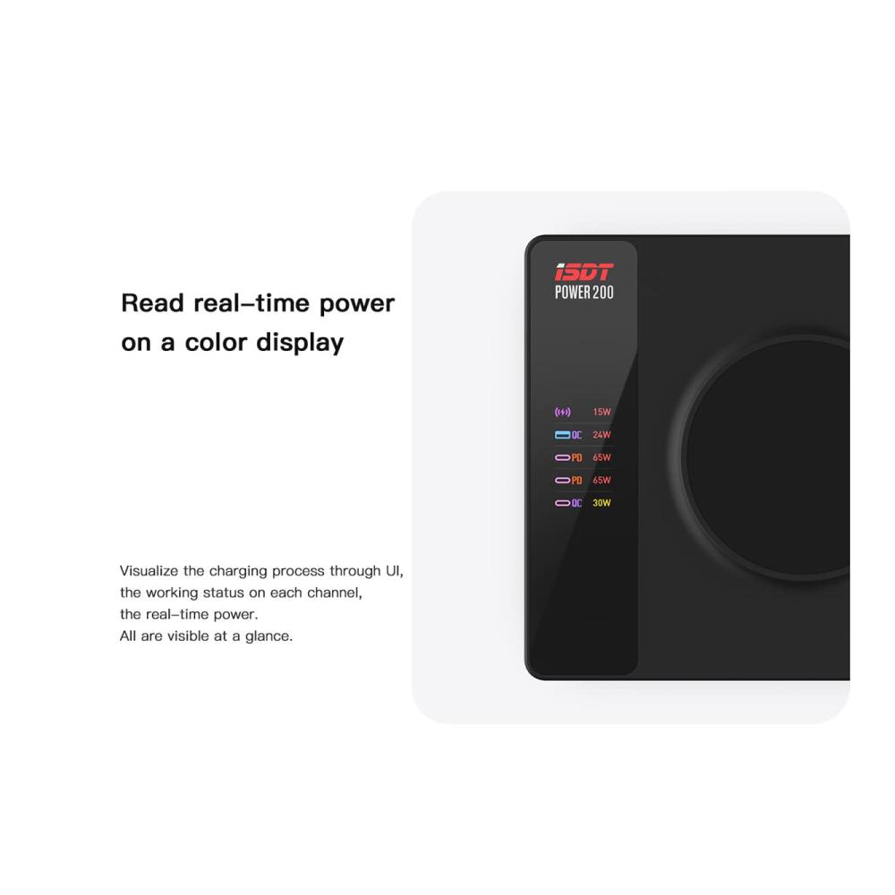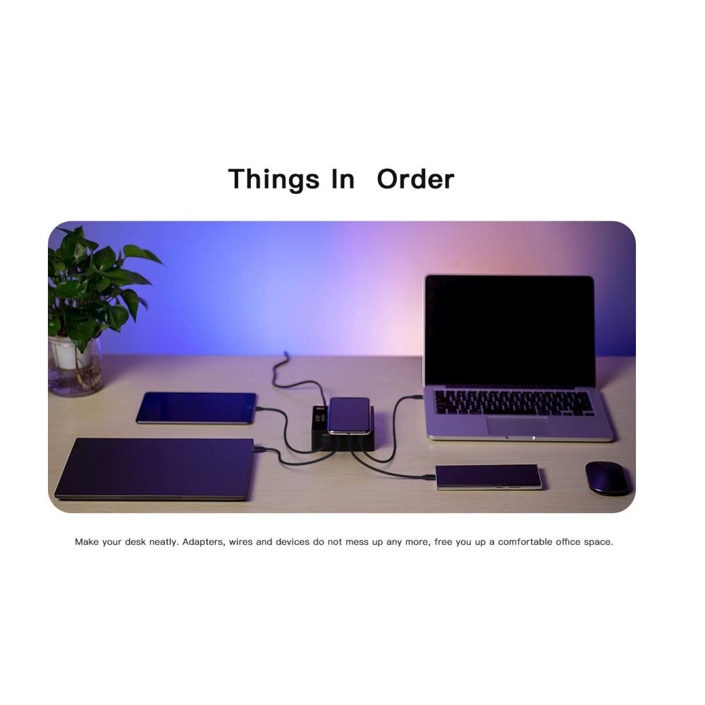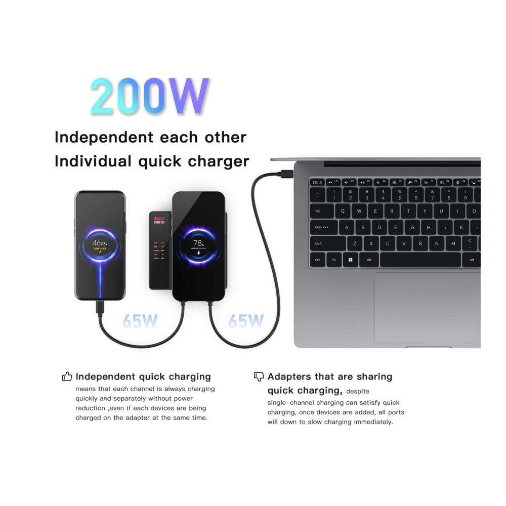 A1: Dieses 200-W-Ladegerät verfügt über insgesamt 5 Ladeanschlüsse, 3 USB-C-Ladeanschlüsse mit einer maximalen Ausgangsleistung von 65 W/100W/140W und einen USB-A-Ladeanschluss mit einer maximalen Ausgangsleistung von 24 W. Die Oberseite des Ladegeräts ist ein kabelloser Ladeanschluss mit magnetischer Saugfunktion. Der Ladeanschluss kann mit dem iPhone 14 und MacBook Pro verwendet werden.