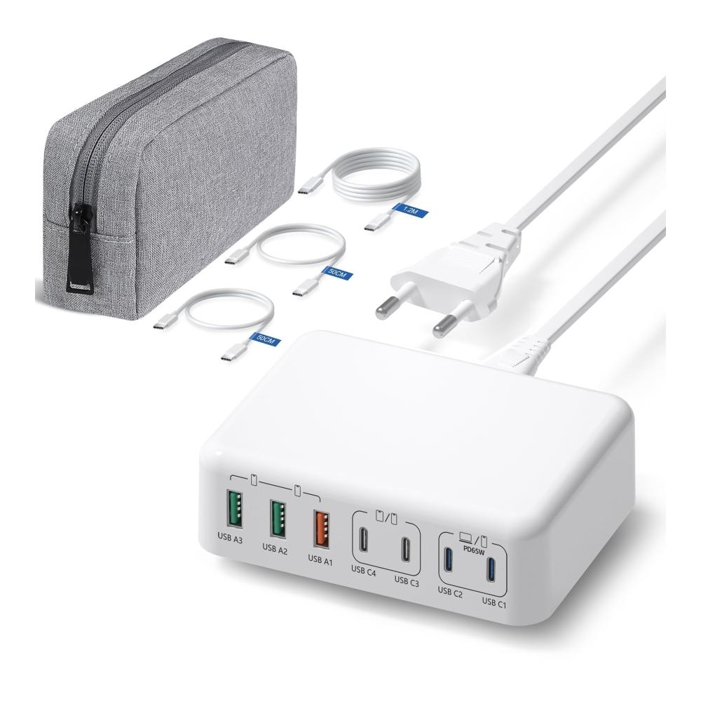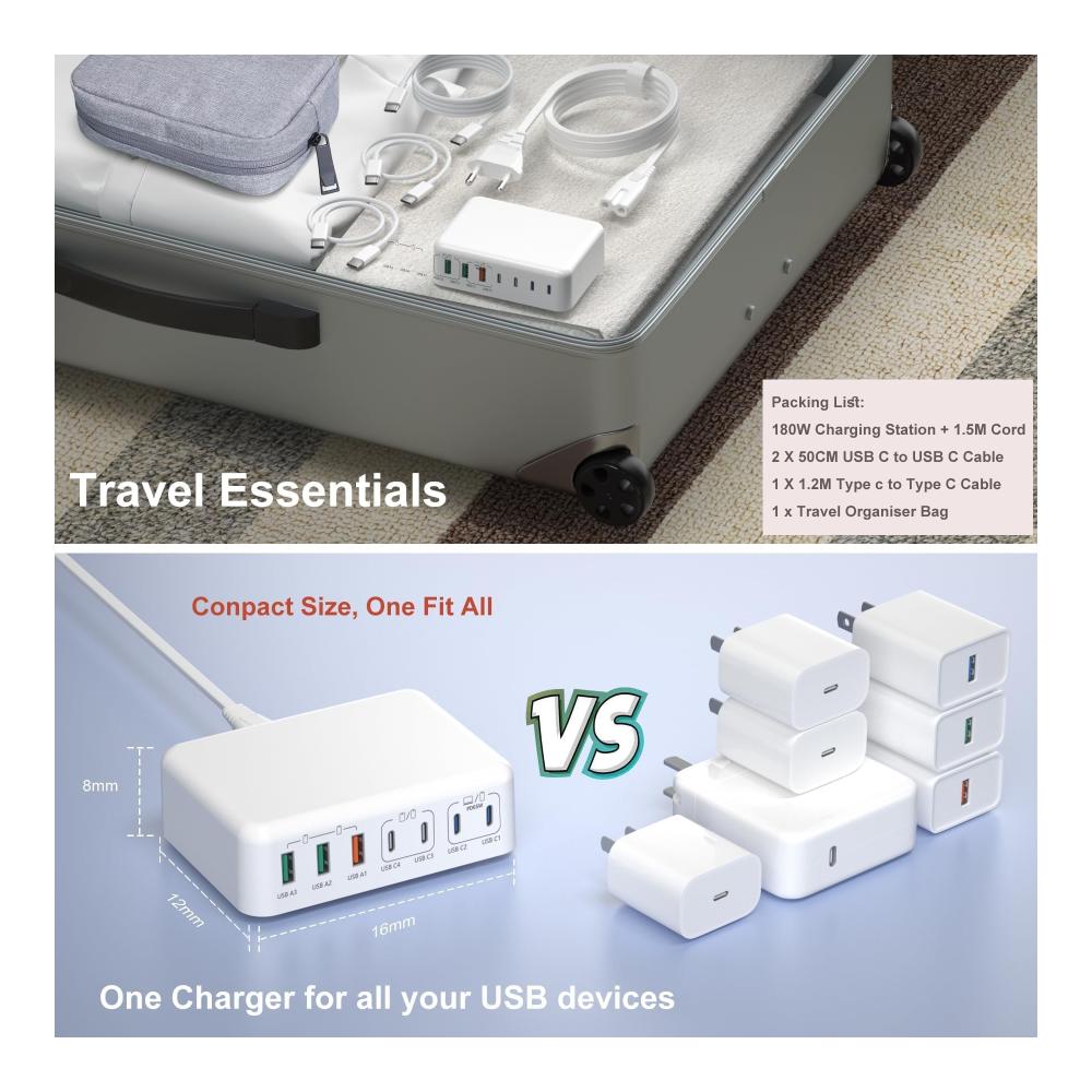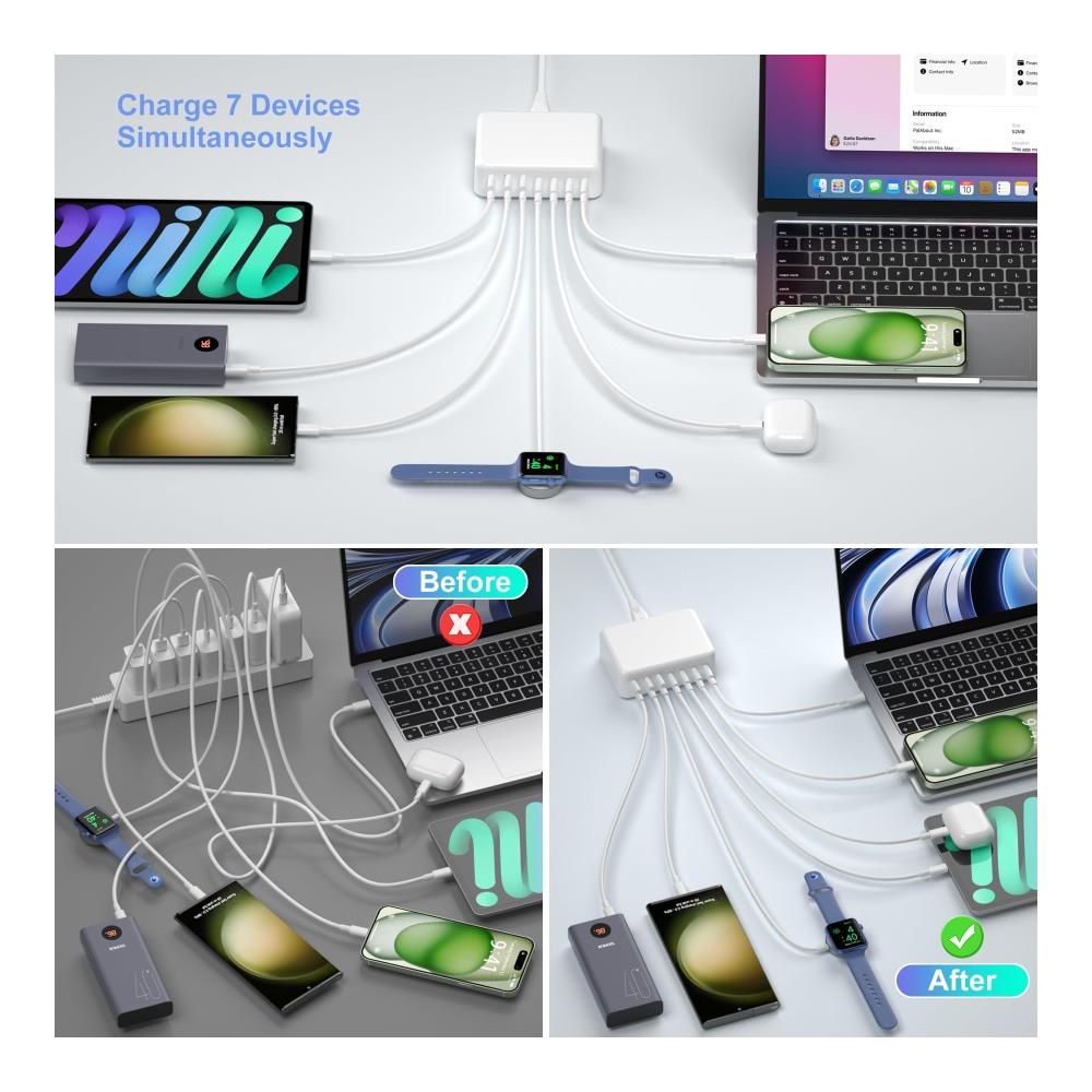 【180W 7-Port USB C Ladegerät】- Diese 7-Port USB C Ladestation mit bis zu insgesamt 180W Leistung, ausgestattet mit 4xUSB-C Ports und 3xUSB-A Ports, um 7 Geräte gleichzeitig aufzuladen, wie z.B. Laptops, Telefon, Tablets, Kopfhörer, usw., was sehr geeignet ist für Zuhause, Büro, Reisen, usw. Dieses 180W USB-C-Ladegerät ist ein großer Platzsparer, anstatt 7 Steckdosen zu belegen. Der beste Ersatz für Ihr originales USB-Ladegerät