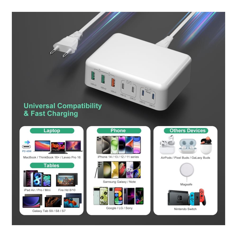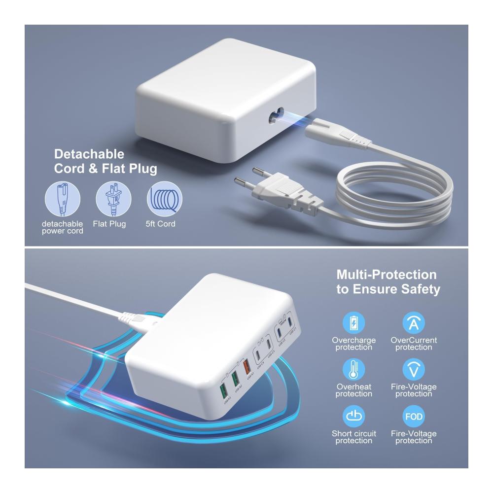 180W usb ladegerät mehrfach Kann mehrere Geräte gleichzeitig aufladen, ausgestattet mit eingebauten mehreren Schutzvorrichtungen, um effizientes und sicheres Aufladen zu eusure. Breite Kompatibilität mit verschiedenen Geräten wie MacBook Pro, Samsung Galaxy, etc. Abnehmbares 1,5-Meter-Verlängerungskabel, tragbares und reisefreundliches Design