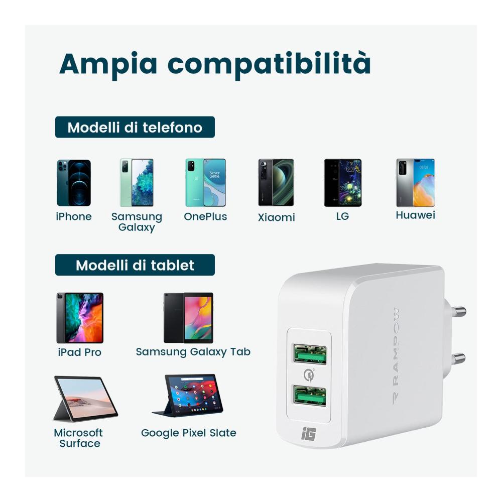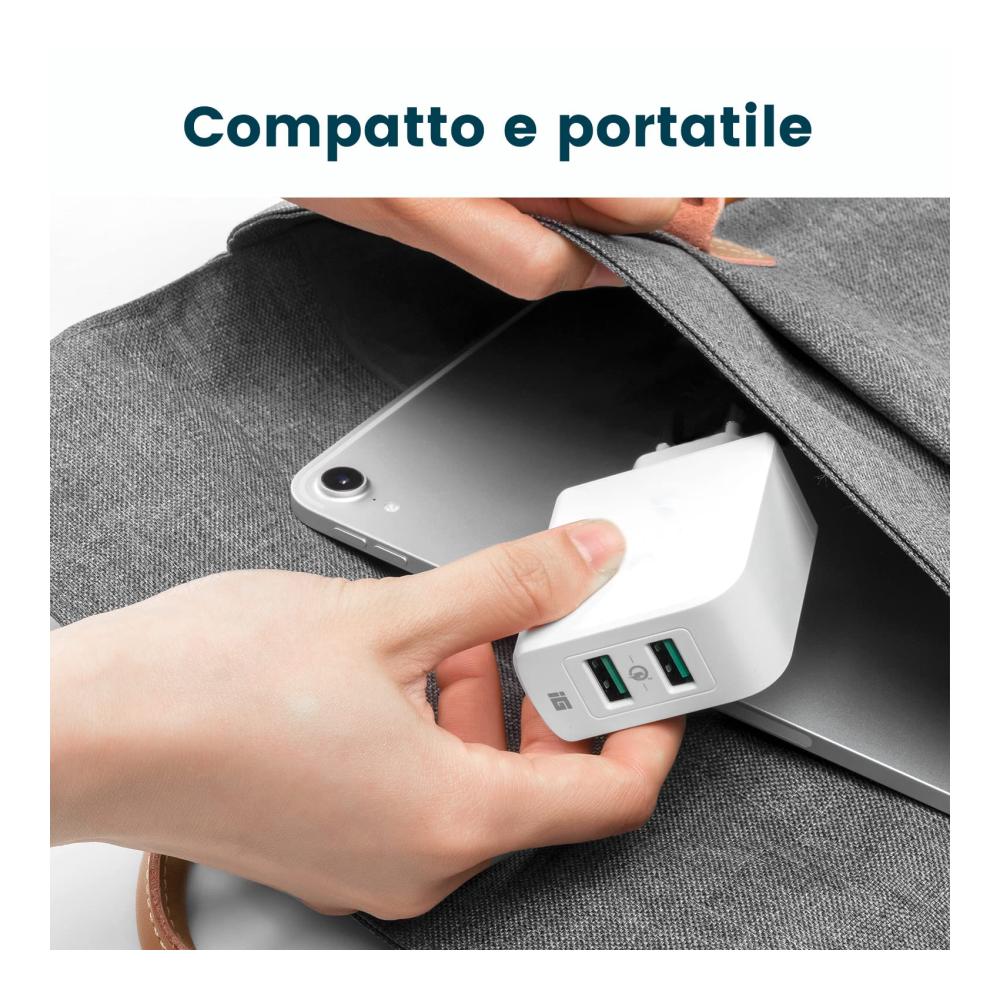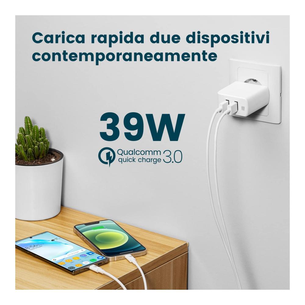 Laden Sie Ihre Geräte unterwegs schnell und bequem auf mit diesem USB-Ladegerät Quick Charge 3.0. Dank der 2 Anschlüsse und einer Leistung von 39 W können Sie mehrere Geräte gleichzeitig aufladen. Kompatibel mit Samsung Galaxy Note 9, Huawei Mate 30, Xiaomi 6X, LG G6 und anderen.