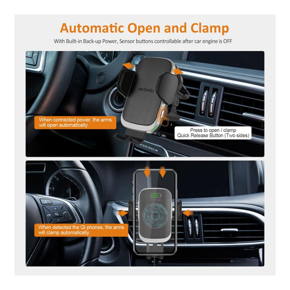 • 【Automatisches Sensor-Spannen mit Eingebaute Antrieleistung & Einhandbedienung】Der klemmarm kann das Handy schnell erkennen und stabil und eng festhalten. Die Arme können durch Drücken der Sensortasten gesteuert werden und sind auch nach ausgeschaltetem Automotor noch (2-3 Mal) steuerbar. ※Dehnen Sie die verstellbaren Haltefüße um auf große Handy zu passen, Andernfalls richtet sich das Telefon nicht an der Ladezentrale aus, der Ladevorgang kann fehlschlagen oder die Effizienz beeinträchtigen!