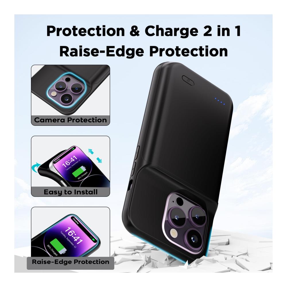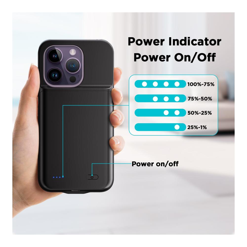 Die Akkuhülle für das iPhone 14 Pro bietet mit einer Kapazität von 6800mAh eine erweiterte Akkuleistung. Der schwarze Kunststoffschutz sorgt für eine einfache Handhabung und verhindert Kurzschlüsse, Überhitzung und Überladung. Dank der Sync-Through-Technologie können Sie Ihr Telefon synchronisieren, ohne die Hülle zu entfernen. Das Paket enthält eine Ladetasche.