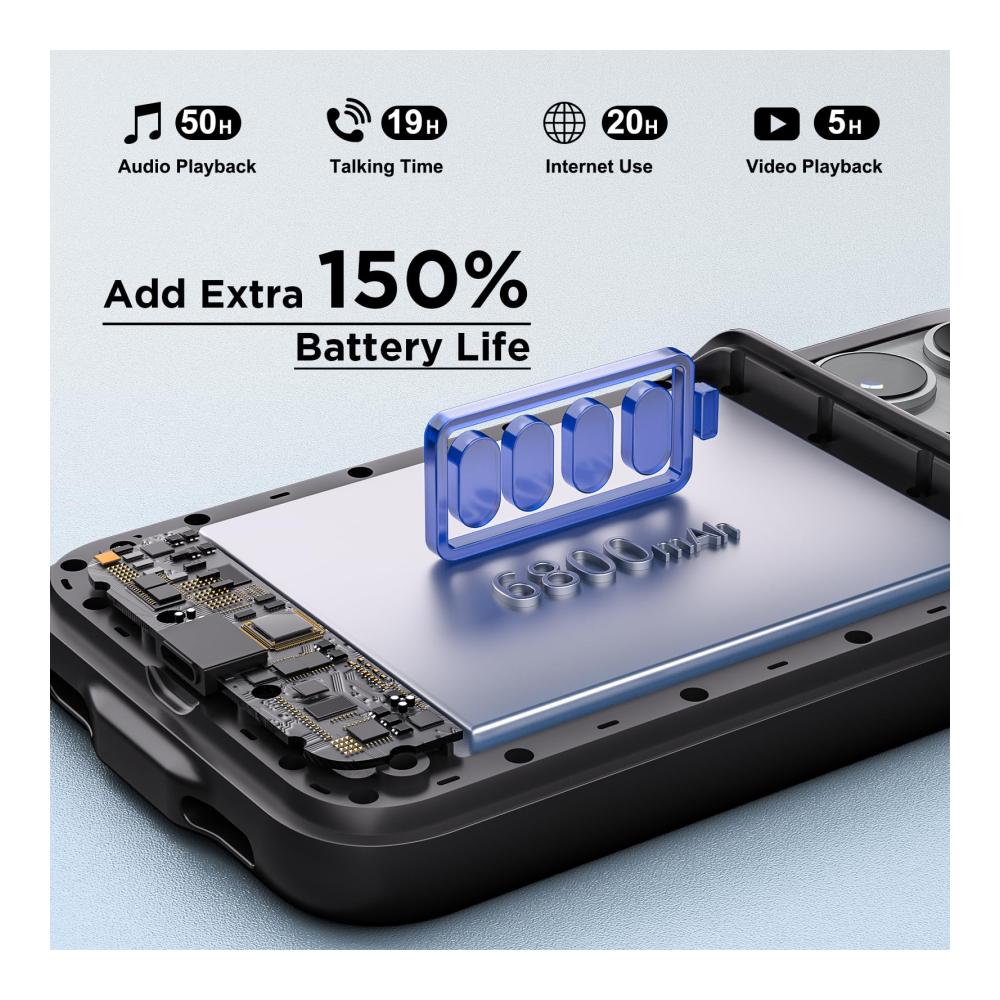 [Upgrade-Kapazität] – Die Upgrade-Kapazität von 6800mAh bietet Ihnen mehr als 150% Leistung für Ihr iPhone, d.h. Sie erhalten zusätzliche 50 Stunden Audiozeit, 19 Stunden Gesprächszeit, 20 Stunden Internetnutzung und 5 Stunden Spielzeit, so dass Sie sich keine Sorgen machen müssen, dass Ihnen der Strom ausgeht.