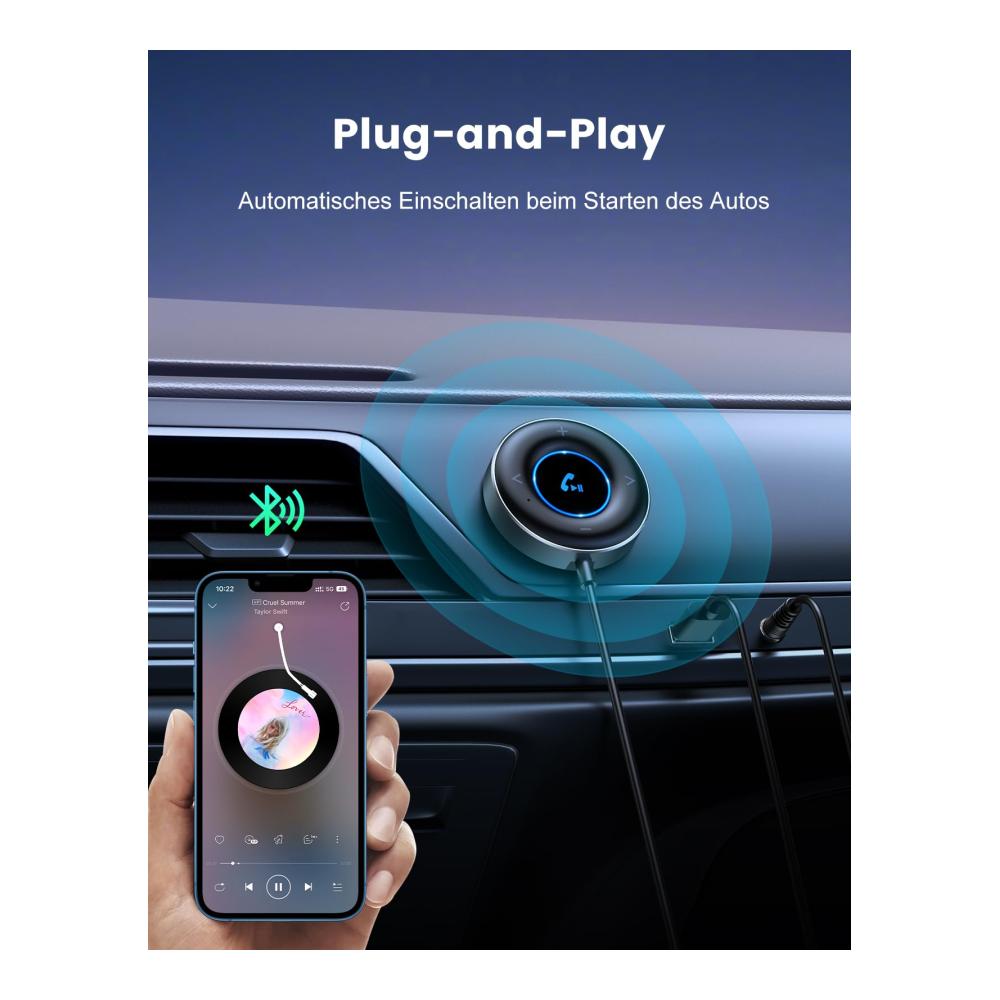【Plug & Play】 Einfach den Bluetooth Adapter Auto in die 3,5-mm-AUX-Buchse stecken und über USB mit Strom versorgen. Dank dieses speziellen Designs schaltet er sich automatisch beim Starten des Autos ein, sodass Sie sich keine Gedanken mehr über die Akkulaufzeit machen müssen. Eine weitere Überraschung ist die automatische Wiederverbindung mit dem zuvor gekoppelten Gerät beim Einschalten dank der Speicherfunktion.