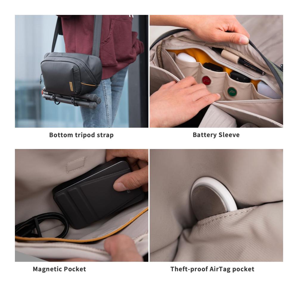 【Unterer Stativgurt und YKK-Reißverschluss】Der untere Riemen der kleinen Kameratasche kann ein Stativ tragen; YKK-Reißverschlüsse haben eine dreimal so lange Lebensdauer wie normale Reißverschlüsse und gewährleisten so nicht nur Sicherheit, sondern auch Haltbarkeit.