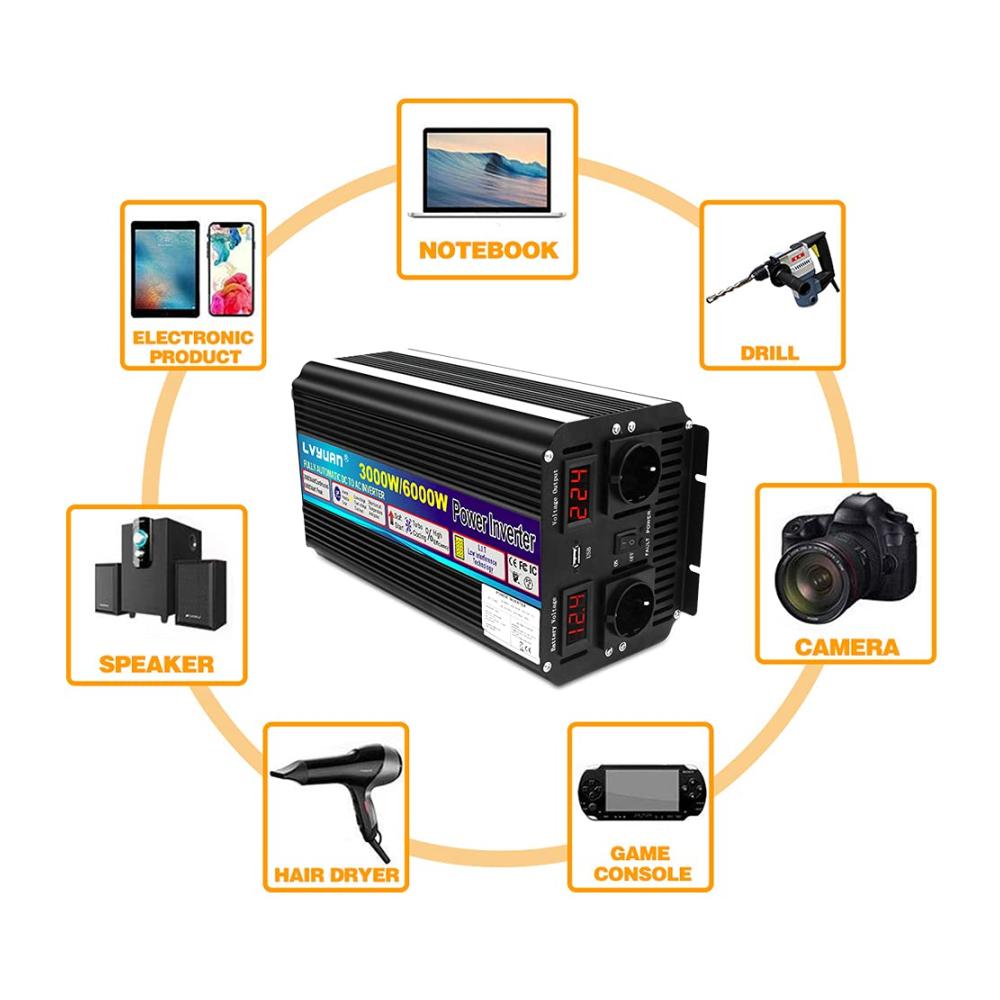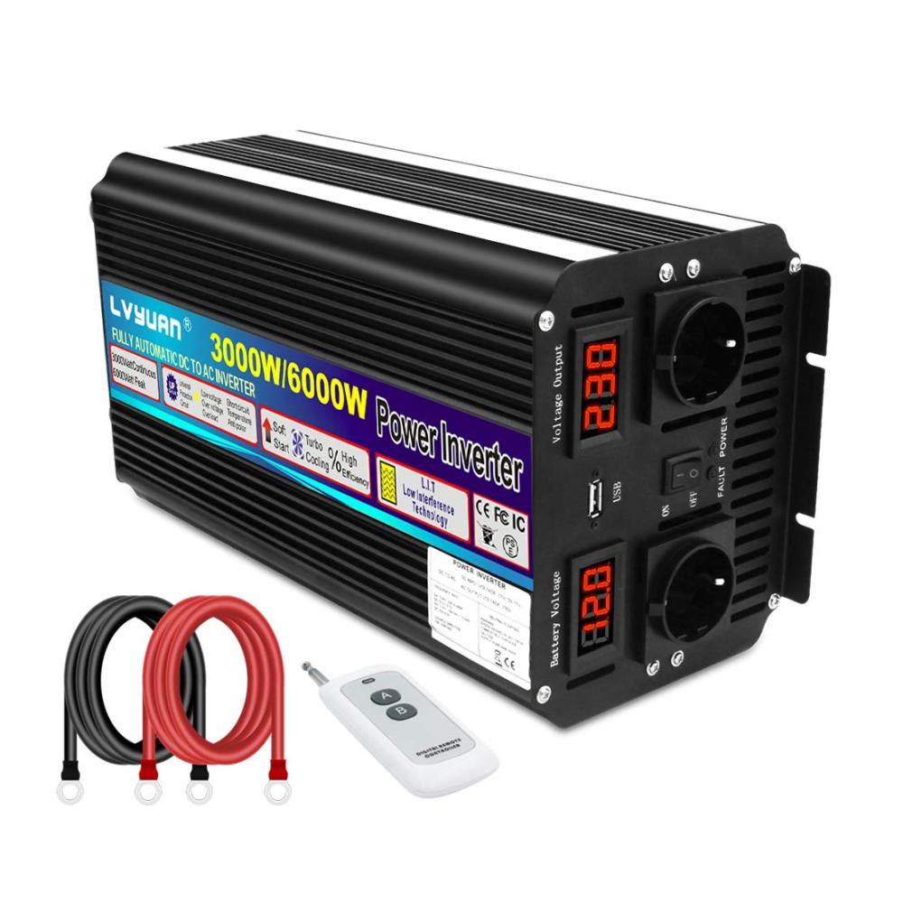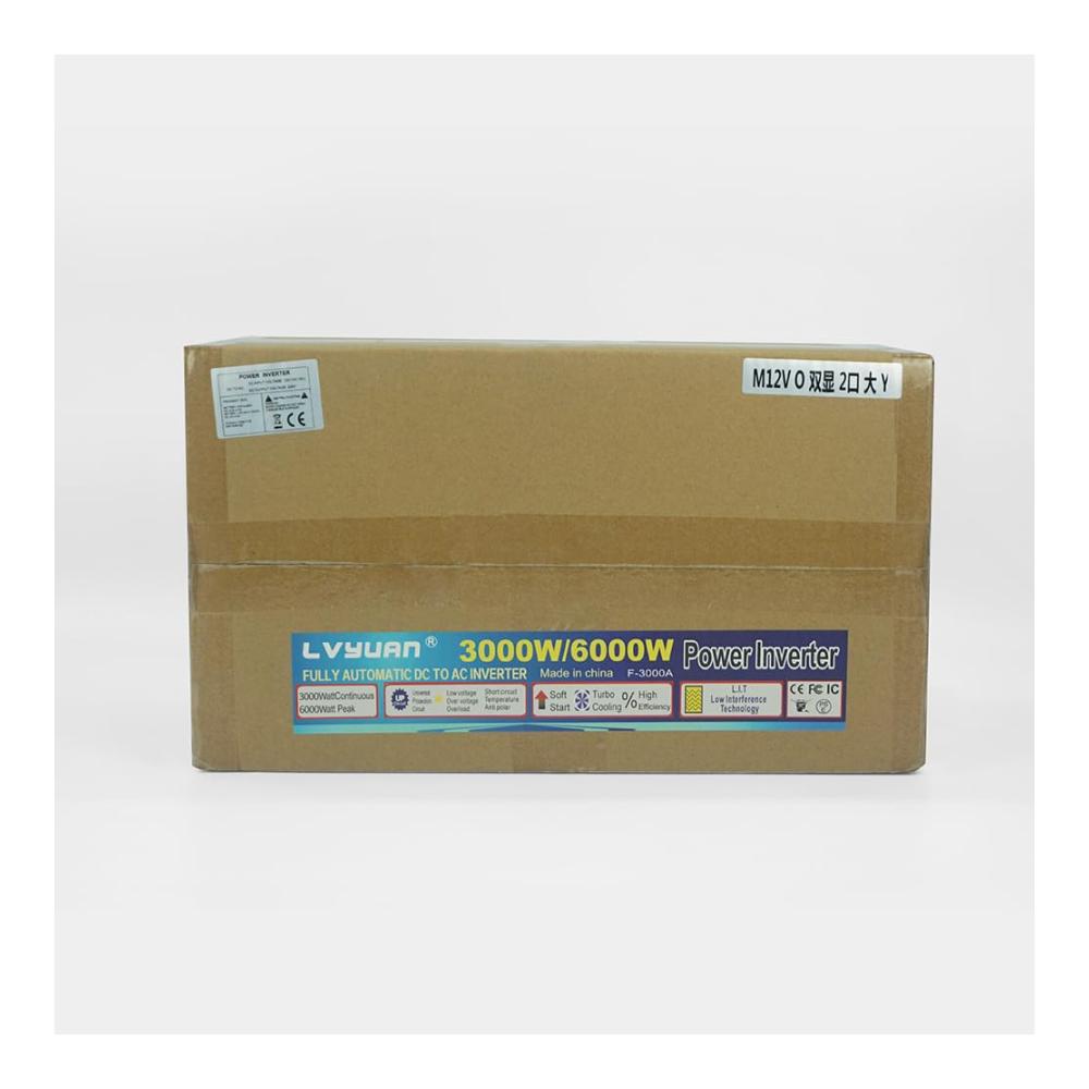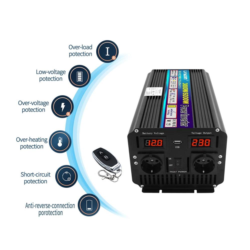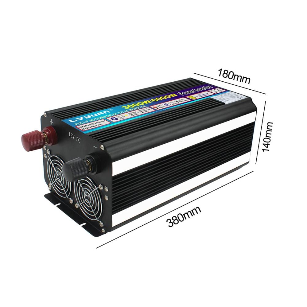 LVYUAN hat sich seit 20 Jahren auf die Herstellung von Wechselrichtern konzentriert.Entworfen als ein echter leistungsstarker Wechselrichter mit hoher Leistung, um mehrere Lasten und wichtige Haushaltsgeräte unterwegs mit Strom zu versorgen. Hergestellt mit hochwertigen Teilen mit professionellem Kundenservice für Endverbraucher.Es sollte den Wechselrichter mit einer Batterie verbinden und dann an elektrische Geräte, Telefone, Laptop, Tablets und so weiter anschließen.Beschreibung:Eingangsspannung: DC 12V (10V- 15.5V)Ausgangsspannung: AC220V ± 5%Ausgangs-Dauerleistung: 3000WÜberspannungsleistung: 6000W<10msFrequenz: 50Hz ± 5%Ausgangswellenform: Modifizierte SinuswelleAbschaltung bei niedriger Batteriespannung (ohne Last): DC 9~9,5VHohe Batterieabschaltung (keine Last): DC 15~15,5VOver Thermal:Automatisches Abschalten des AusgangsEingebaute Sicherungen: KurzschlussschutzStart: Sanfter Start Schutz: Überlast, Kurzschluss, Übertemperatur, Verpolung, Unter-/ÜberspannungDualLED-Anzeige, Eingangsspannung und AusgangsspannungEin 5V-USB-Anschluss für Gerät.Spitzenwirkungsgrad: >90%Temperaturgesteuerter LüfterArbeitstemperatur: 0~40 Grad Celsius MaschineGröße: 42,7 x 24,6 x 21,8 cmNettogewicht: 4.62 KilogrammKabellänge: 50cmPaket enthalten:1 x Wechselrichter2 x Kabel1 x Drahtlose Fernbedienung1 x BenutzerhandbuchBITTE BEACHTEN:1. Bitte verwenden Sie die mitgelieferten Standard-Batteriekabel, da sonst die volle Leistungsabgabe nicht gewährleistet werden kann. Und die Ersatzsicherungen in der Packung werden nur verwendet, wenn die Originalsicherungen versehentlich durchgebrannt sind.2. Bitte verbinden Sie den Wechselrichter nicht mit dem Netzstrom, und eine umgekehrte Verbindung von Plus und Minus ist ebenfalls verboten.3. Bitte überlasten Sie nicht.