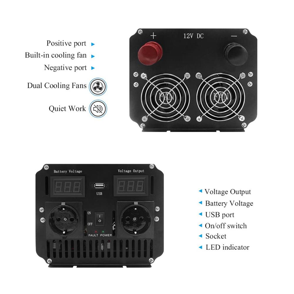 Dank der drahtlosen Fernbedienung haben Sie die volle Kontrolle innerhalb von 10 Metern. Die duale LED-Anzeige zeigt die Eingangs- und Ausgangsspannung an. Mit zwei EU-Steckdosen, einem 5V-USB-Anschluss und einem Temperaturgesteuerten Lüfter ist dieser Wechselrichter vielseitig und zuverlässig. Das Paket enthält alles, was Sie für die Nutzung benötigen.