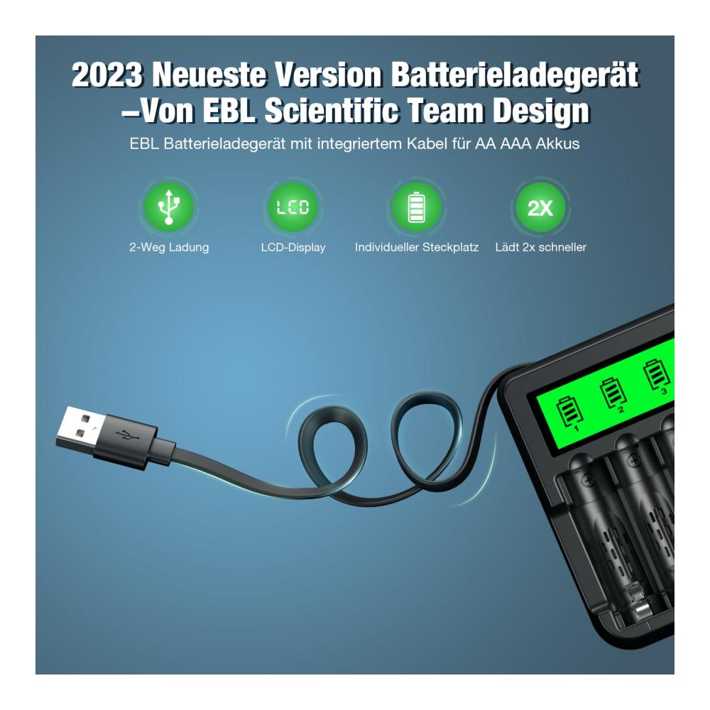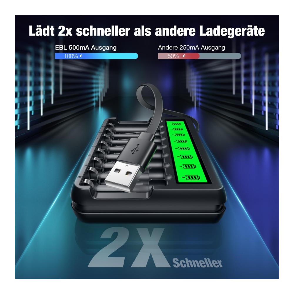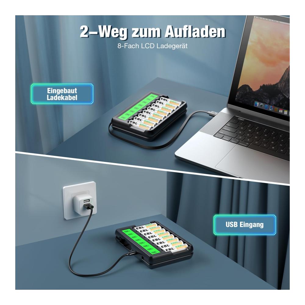 【2 IN 1 Funktion Batterieladegerät】- EBL 2023 neueste Version 8-Schacht LCD Batterieladegerät mit eingebautem Ladekabel oder Micro USB Eingang. Tragbar und bequem nur ein Adapter zu verwenden, ohne extra Kabel.