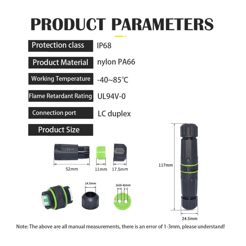 Spezifikation: Farbe: Schwarz Material: Außenmaterial Nylon PA66 Schutzart: IP68 Anschlussport: LC-Duplex Arbeitstemperatur: -40~85℃ Merkmale -Wasser- und staubdicht, geeignet für den Einsatz in rauen Umgebungen -Langlebig -Hochleistungs-Keramikkatheter -Lichtwellenleiter können ohne Verlust frei verlängert werden -IP68 wasserdicht und flammhemmend -Professionelles Design, einfach zu installieren und zu verwenden Das Paket beinhaltet: 1 x wasserdichter LC-Duplex-Stecker Kundendienst Unser professionelles Kundendienstteam steht Ihnen zur Verfügung, um After-Sales-Probleme zu lösen. Gerne können Sie es kaufen. Bitte kontaktieren Sie uns zunächst bei möglichen fehlerhaften Produkten. Wir werden unser Bestes tun, um Ihnen einen Ersatz oder eine Rückerstattung zu bieten.