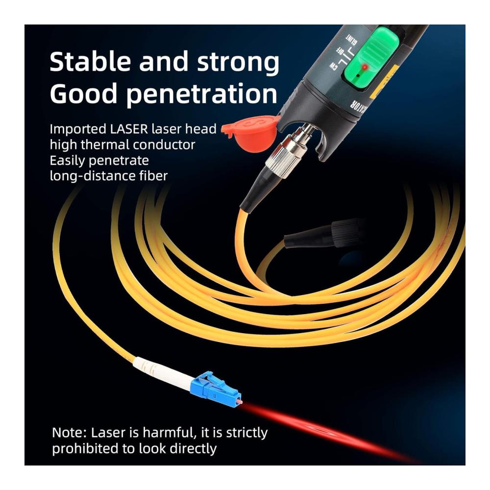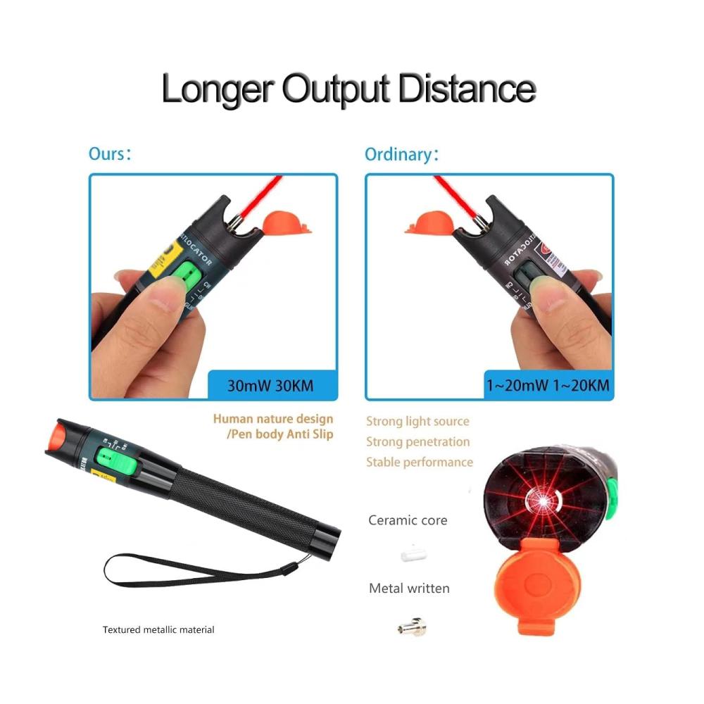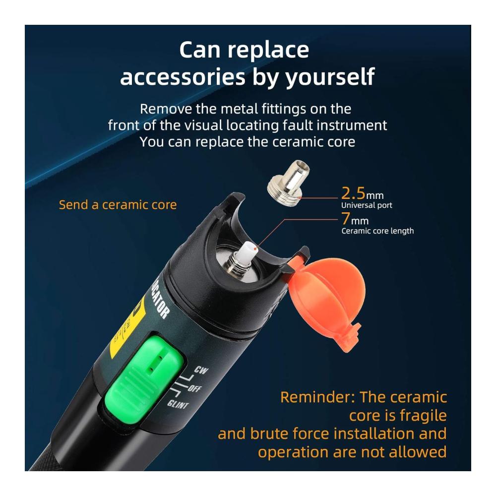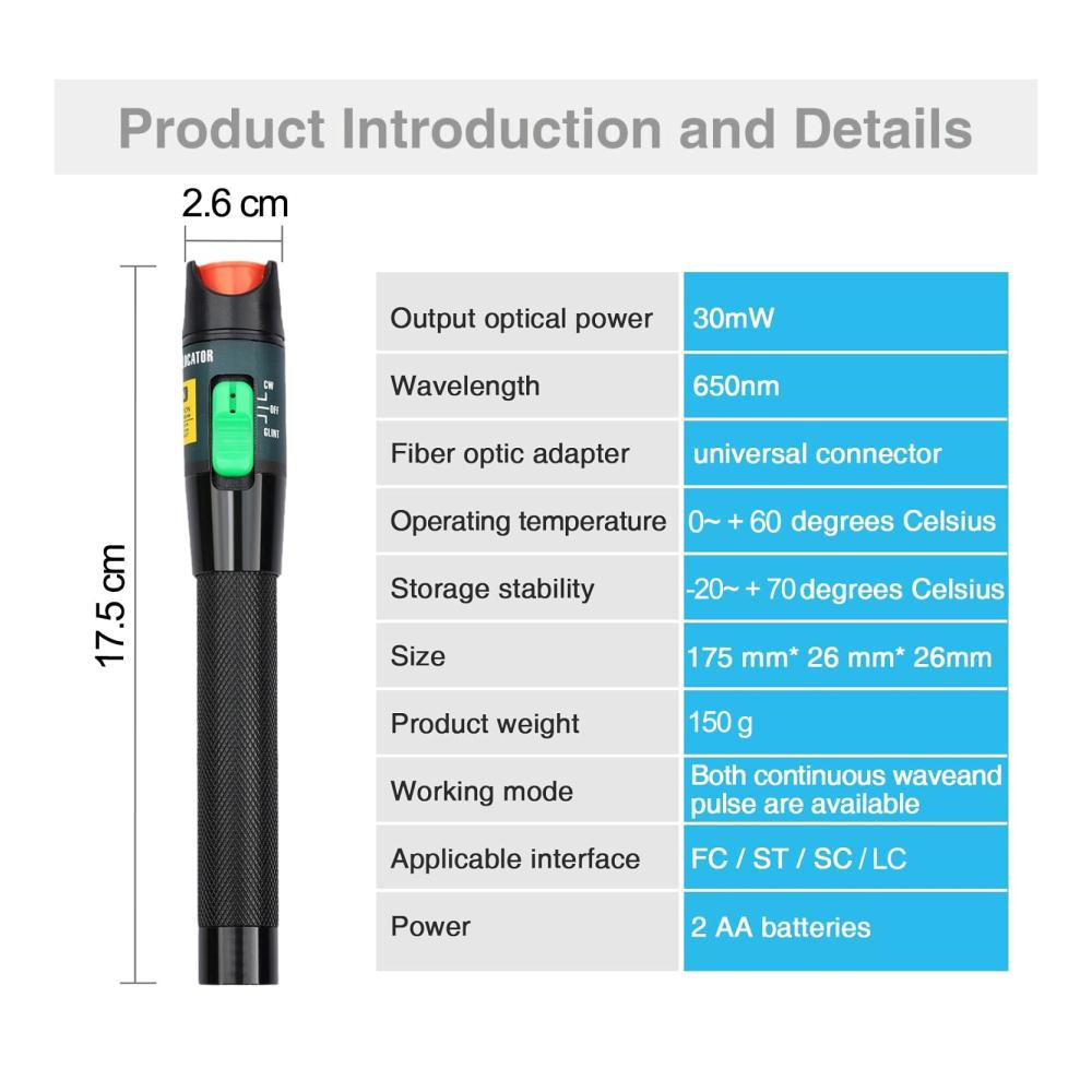 Der präzise und effiziente Glasfaserkabel Tester Stift von POCHY bietet eine optische Ausgangsleistung von über 30MW und eine Ausgangsreichweite von bis zu 30 km. Mit einer Wellenlänge von 650nm (±20nm) ist er ideal zur lokalisierung von Faserfehlern wie Brüchen und Biegungen. Der Tester arbeitet sowohl im kontinuierlichen Wellen- als auch im Pulsmodus und ist mit den Schnittstellen ST / SC / FC / LC kompatibel. Das praktische stiftförmige Design macht ihn einfach zu verwenden und zu transportieren.