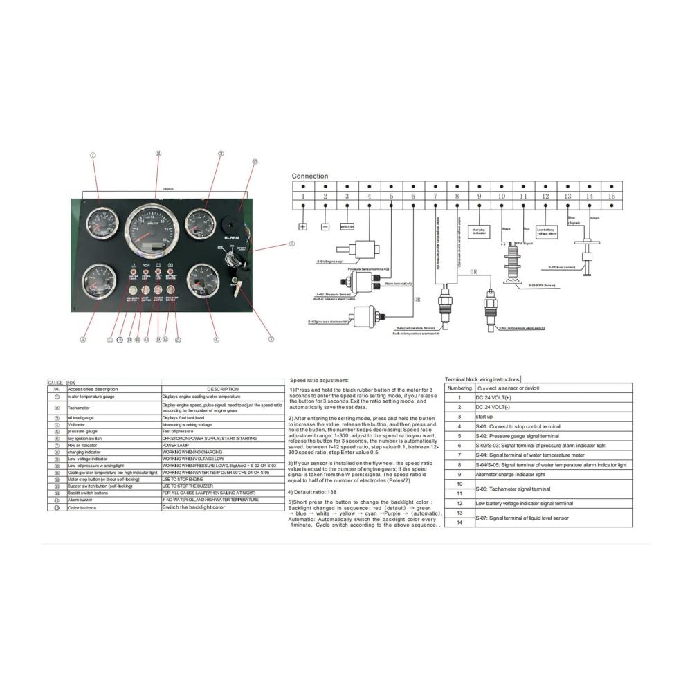 Artikeltyp: Digitales KombiinstrumentMaterial: Edelstahl, ABS, PCFarbe: Schwarzes Panel, silberne AbdeckungHintergrundbeleuchtung: 7 Farbwechsel (Reihenfolge der Hintergrundbeleuchtung (Standard): Rot, Grün, Blau weiß, gelb, cyan, violett)Funktion: Anzeige von Motordrehzahl, Ölstand, Wassertemperatur, Spannung und ÖldruckAnzeigebereich der Wassertemperaturanzeige: 0-120 ℃Anzeigebereich für Öldruck: 0 -150 psiMotordrehzahl: 0–3000 U/min, 99999,9 pro StundeAnzeigebereich der Ölstandsanzeige: E-1/4-1/2-3/4-FSpannungsanzeigebereich: 16-VArbeitsspannung: DC24V-SchaltungssystemArbeitsstrom: ≤ 100 MABetriebstemperatur: – 30 ℃ – 75 ℃Lagertemperatur: – 40 ℃ – 85 ℃Betriebsmodus: LCD-Display, SchrittmotorSchutzart: IP67, es kann in 1 m Tiefe unter Wasser arbeiten und verfügt über eine Antibeschlagfunktion;Technischer Support: Nachprogrammierungstechnologie, Treiber kann geändert werden nach Bedarf, um eine Vielzahl von analogen Eingangssignalen anzupassenAnwendungen: Wird für Motoren, Generatorsätze, Wohnmobile, Yachten, Fischerboote, Schiffe, technische Maschinen, landwirtschaftliche Maschinen, modifizierte Fahrzeuge usw. verwendet Paketliste:1 x digitales Messgerät, 2 x Zündschlüssel1 x Handbuch