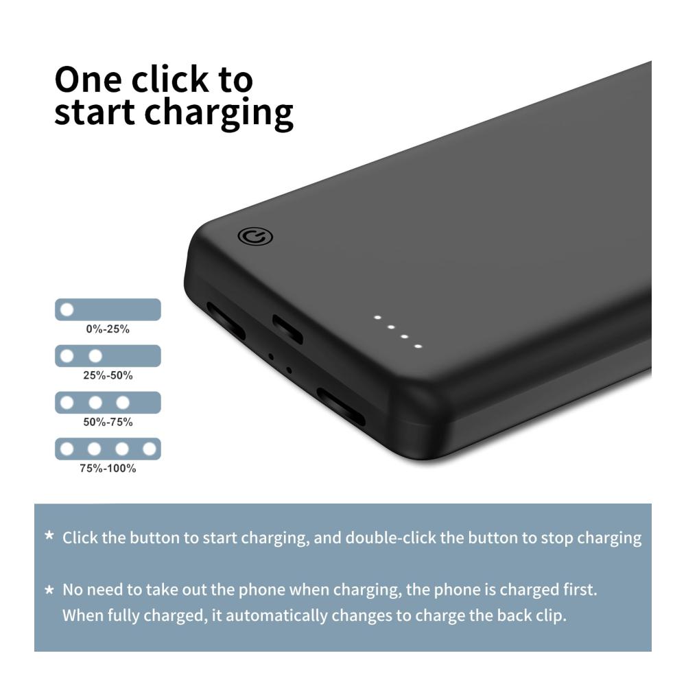[Pixel 7 Handy-Ladegerät-Hülle] Die intelligente LED-Anzeige ermöglicht es Ihnen, die Batterieleistung einfach zu verfolgen. Die 4 LED-Leuchten auf der Rückseite zeigen den Verbrauch des Ladegeräts an (0-25%-50%-75%-100%). Ein Klick, um mit dem Aufladen Ihres Telefons zu beginnen oder den Akku zu verfolgen, ein Klick, um den Ladevorgang zu stoppen.
